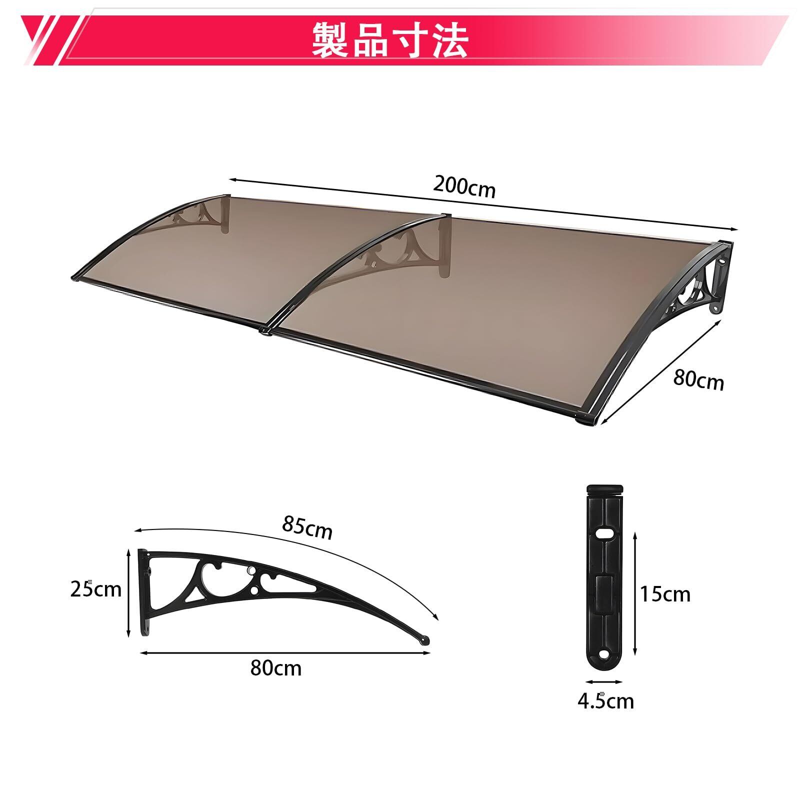 ひさし屋根 後付け 玄関 雨よけ・日よけに 庇 アルミブラケット付き 80x200cm ポリカーボネート採用 ベランダ 遮光 屋根庇 住宅庇 テラス屋根 住宅用 サンシェッター 店舗 雪止めキャノピーパネル 簡単な組み立て 窓/玄関などに設置可能 (茶色)