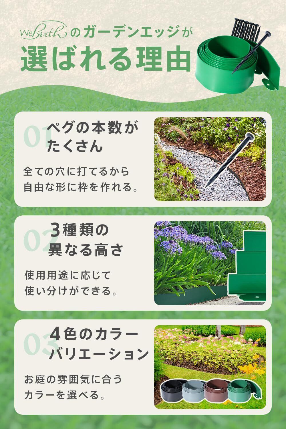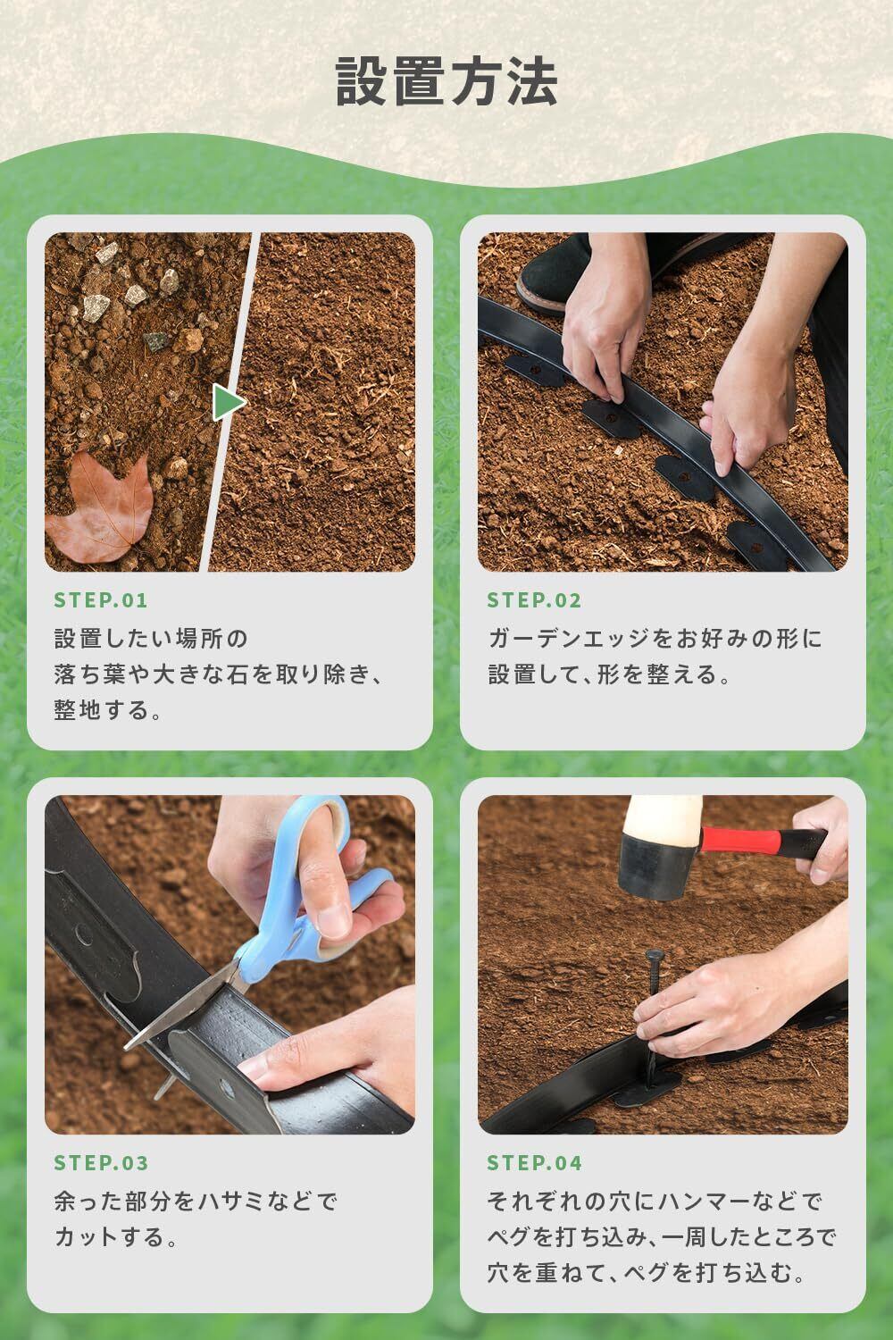 【選べる高さ(5cm/10cm/15cm)で用途にぴったり対応】 5cm:芝生と花壇の境目、砂利の仕切りに最適。目立たず自然な見た目。芝の広がり防止や、すっきりとした境界づくりにおすすめです。 10cm:家庭菜園、低木の花壇、小石やバークチップの飛散防止に。適度な高さで、植物や土をしっかりキープできます。 15cm:土の流出防止や、傾斜地の土留め、大きめの花壇・区画整理に。雨に強く、構造的な仕切りや高さのある植物にも対応できます。