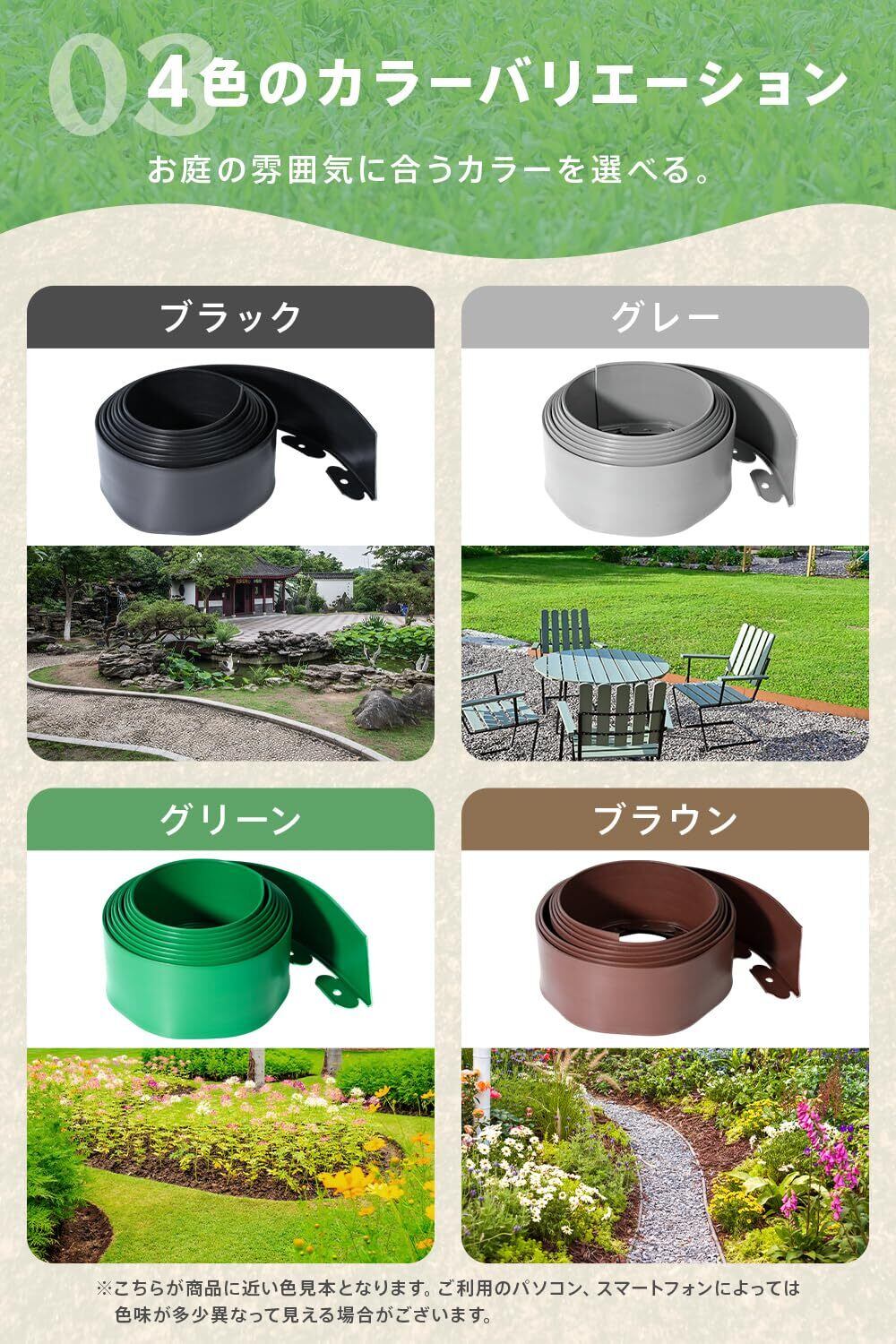 【選べる4色のカラーバリエーション】 ブラック・ブラウン・グレー・グリーンのナチュラルで落ち着いた4色展開。景観を損ねず、庭のデザインにぴったり馴染みます。