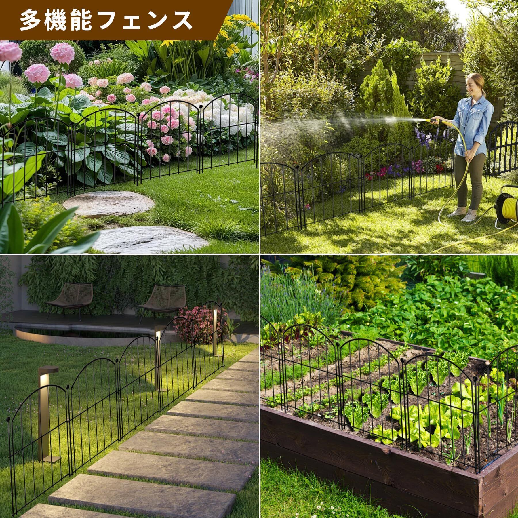 【多用途で実用的】この金属ガーデンフェンスは多くの用途に利用することができます。花壇やお庭、家庭菜園のフェンスや仕切りとして使うことができるだけでなく、小型犬のドックランフェンスや、小動物の逃亡や侵入を防ぐためのバリアフェンスとしても活用できます。アーチ型のデザインもあり、小さなフラワーフェンスとしても魅力的です。