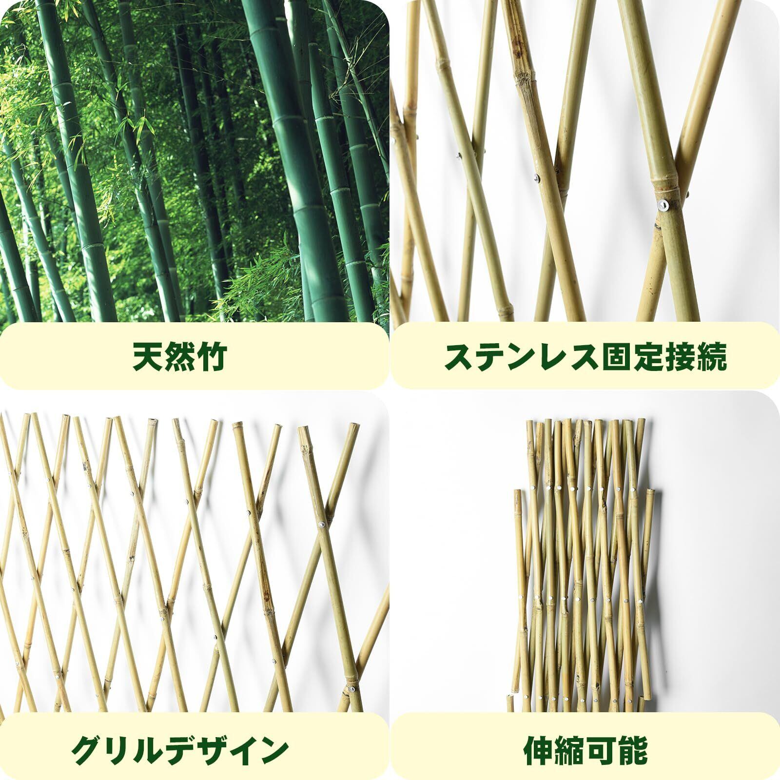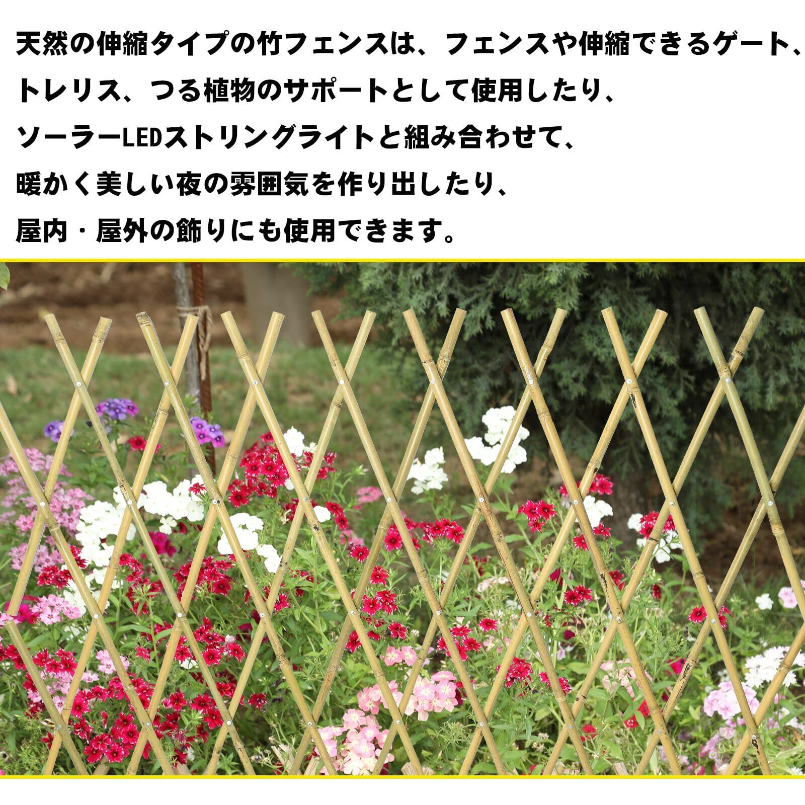 幅広い用途:天然の伸縮竹フェンスはお庭フェンスや伸縮ドア、つる植物のサポートとして、例えば、キュウリ、ブドウのつる、トマトなどのクライミング植物の成長を補助します。太陽LEDストリングライトと組み合わせると、夜に暖かい雰囲気を作り出し、屋内・屋外の飾りにも使用します。