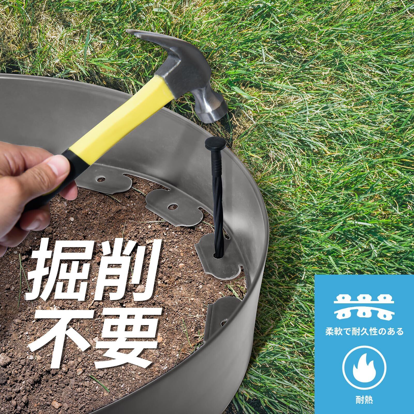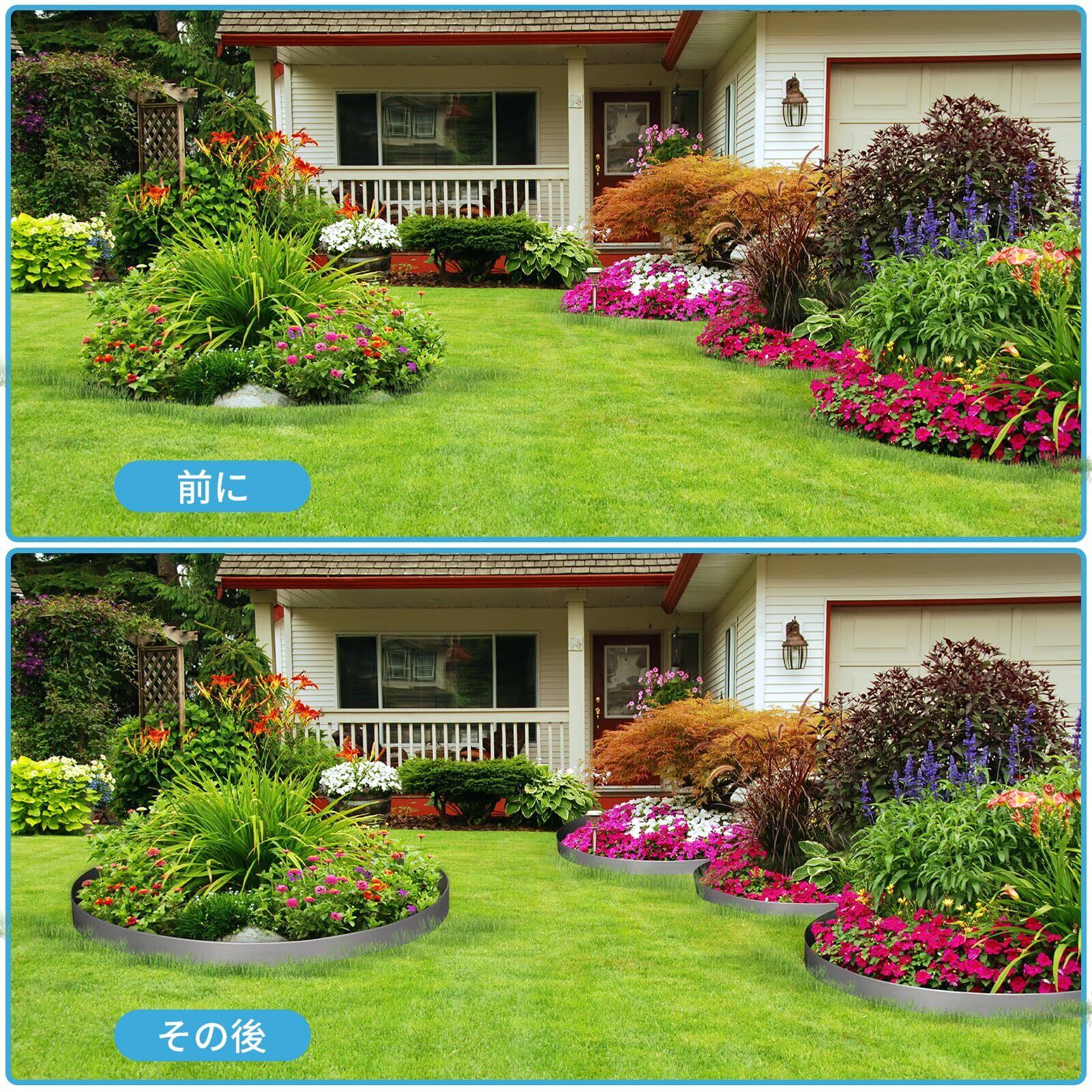 【美観性の向上】- この「ガーデンエッジフェンス」を設置することで、庭のデザインが引き立てられ、より整然とした印象を与えるだけでなく、花壇と芝生の間の明確な境界線が庭全体の美しさを引き出します。さらに、土留めとしての役割を果たし、花壇内の土が流れ出ることを防ぐとともに、雑草の侵入を抑制し、庭のメンテナンスを楽に行うことができます