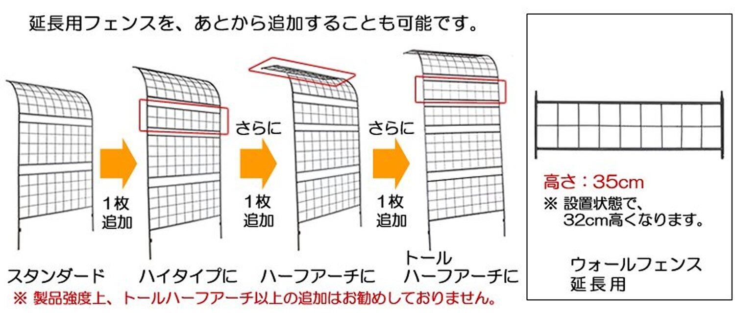 【注意事項】安全にお使いいただくために適宜転倒防止対策をしてください。強度上、延長用フェンスの追加はトールハーフアーチの大きさ(アーチ部に1つ、フェンス部に2つ)までをおすすめします。