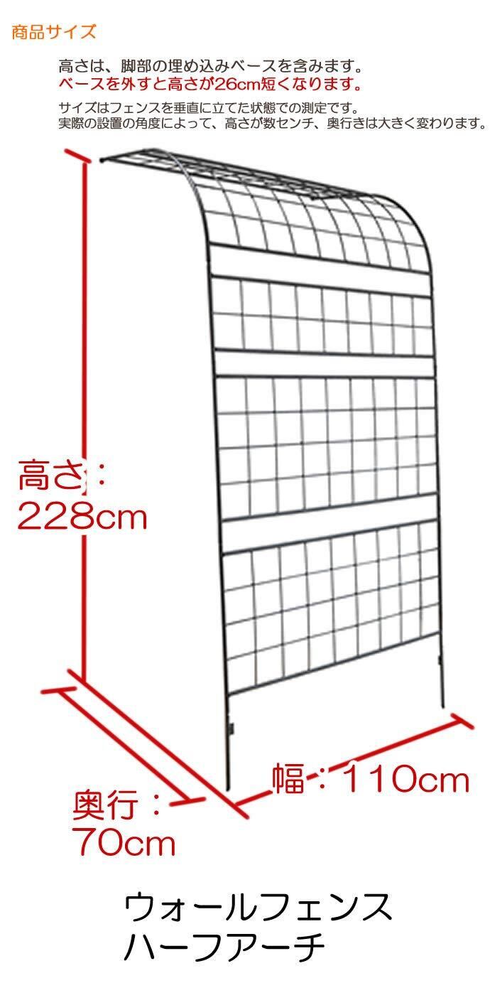 サイズ: 幅110cm×高さ228cm×奥行70cm ※埋め込みベースを外すと26cm程度低くなります。サイズはフェンスを垂直に立てた状態での測定です。実際の設置の角度によって、高さが数センチ、奥行きは大きく変わります。