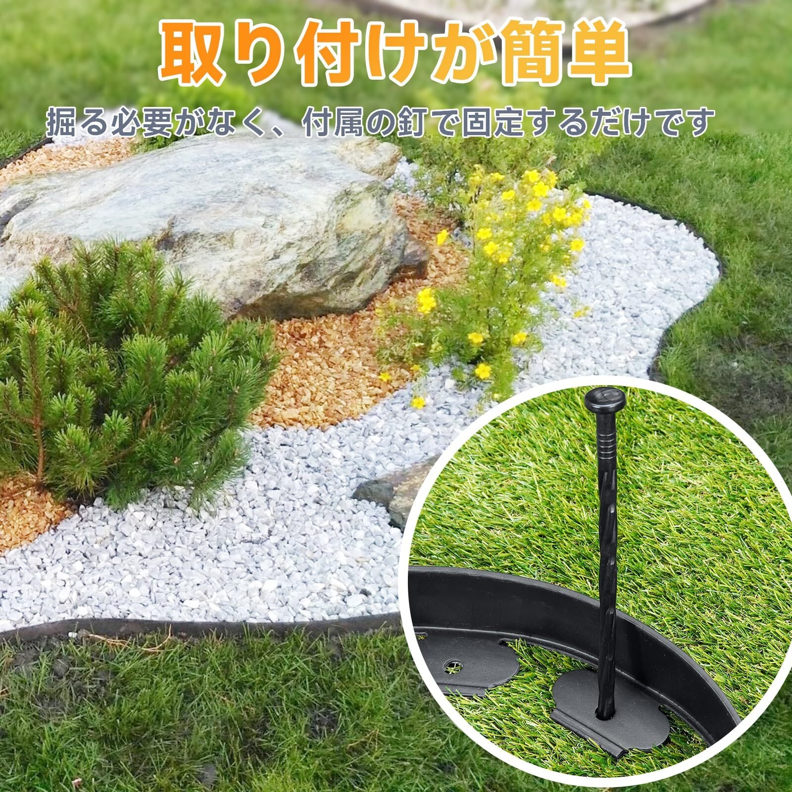 【簡単に設置】製品を好きな形に置いて、あとは固定ピンをゴム槌で軽く叩くだけ。女性でも簡単に扱えるので、お庭のDIYに最適です。付属のペグは硬い地面には使用できませんのでご注意ください。
