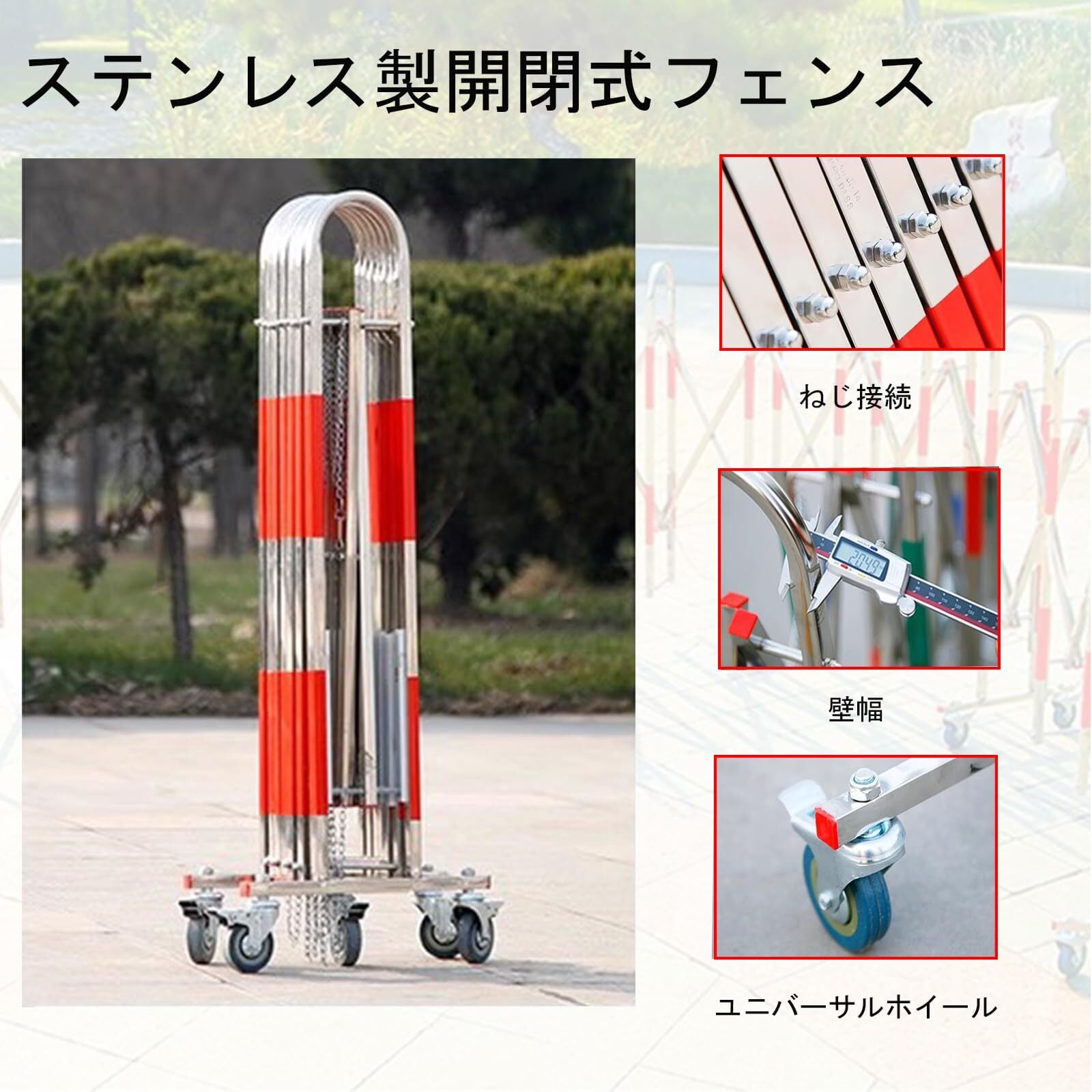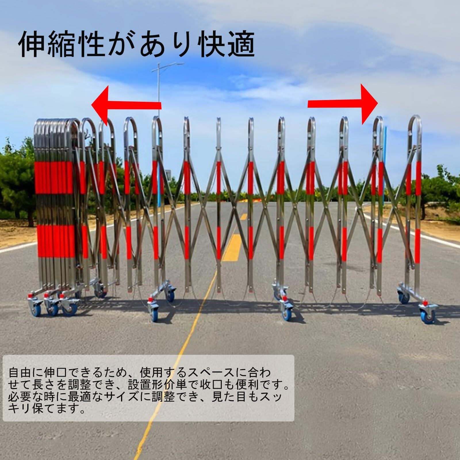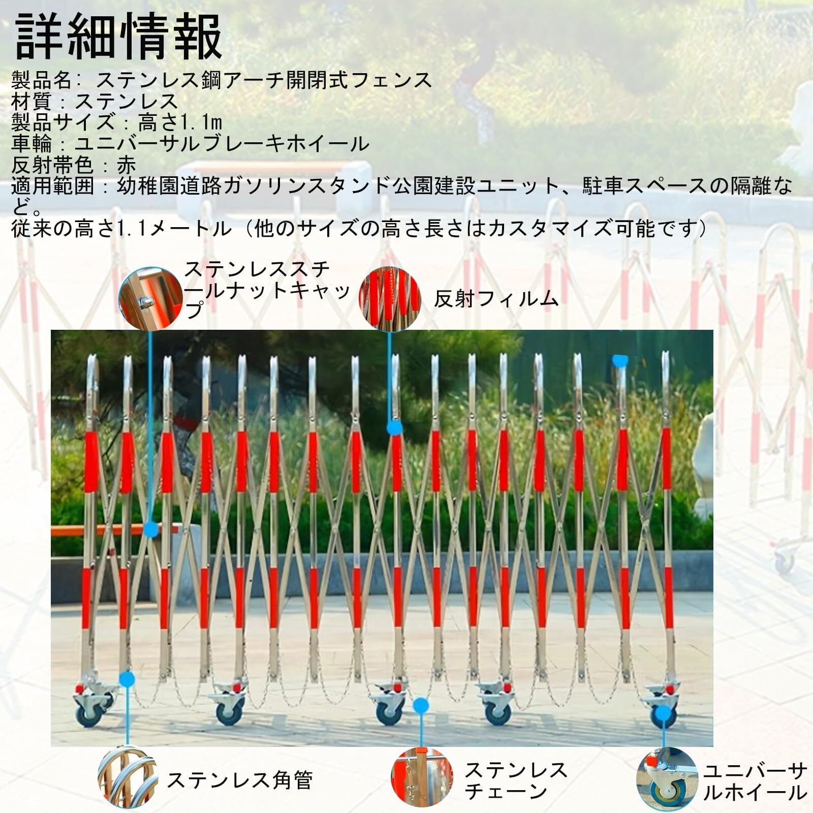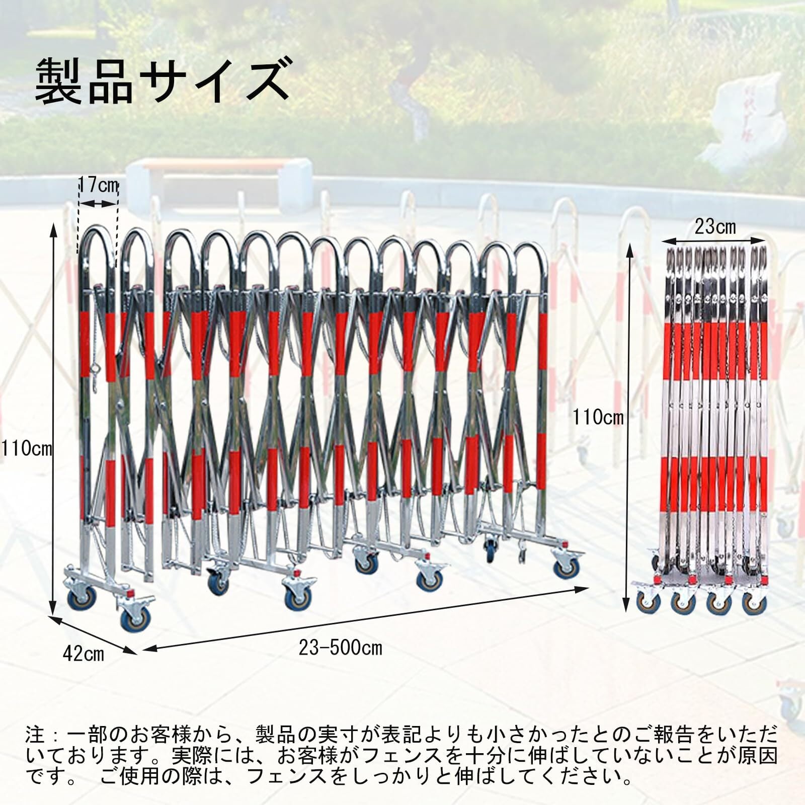 仕様:伸縮式フェンスはキャスターと支柱の2つの部分で構成されています。 高さ110cm、幅42cm、展開時の長さ5m、完全に閉じた時:23cm。