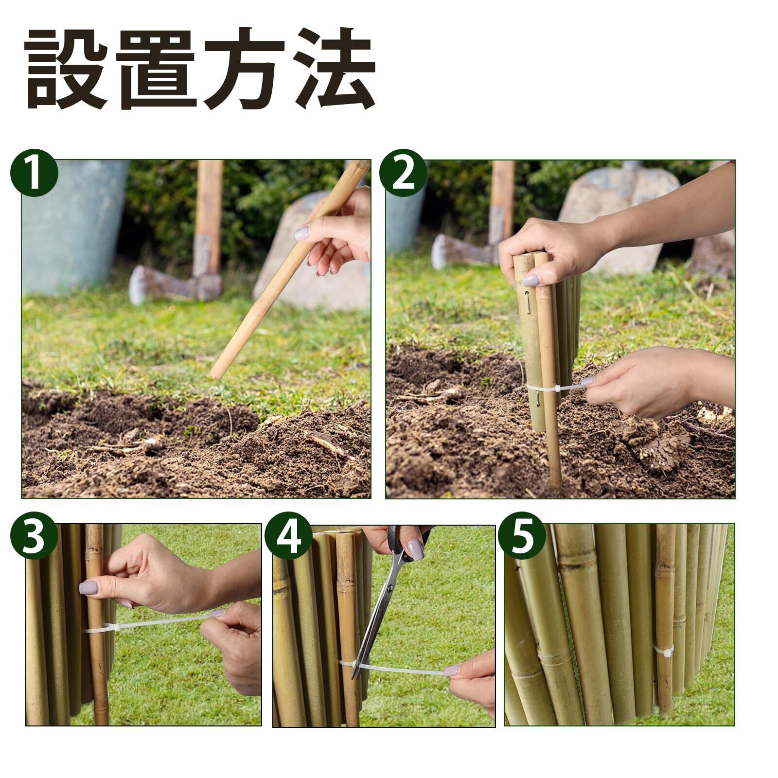 使用方:竹フェンスの高さは20cm、長さは100cmで、毎竹の直径約2cmです。取り付けは簡単で、掘る必要がなく、地面に置いて直立させるだけ、補助竹竿に結束バンドで結びてガーデンエッジが固定。お庭を飾ることができます。