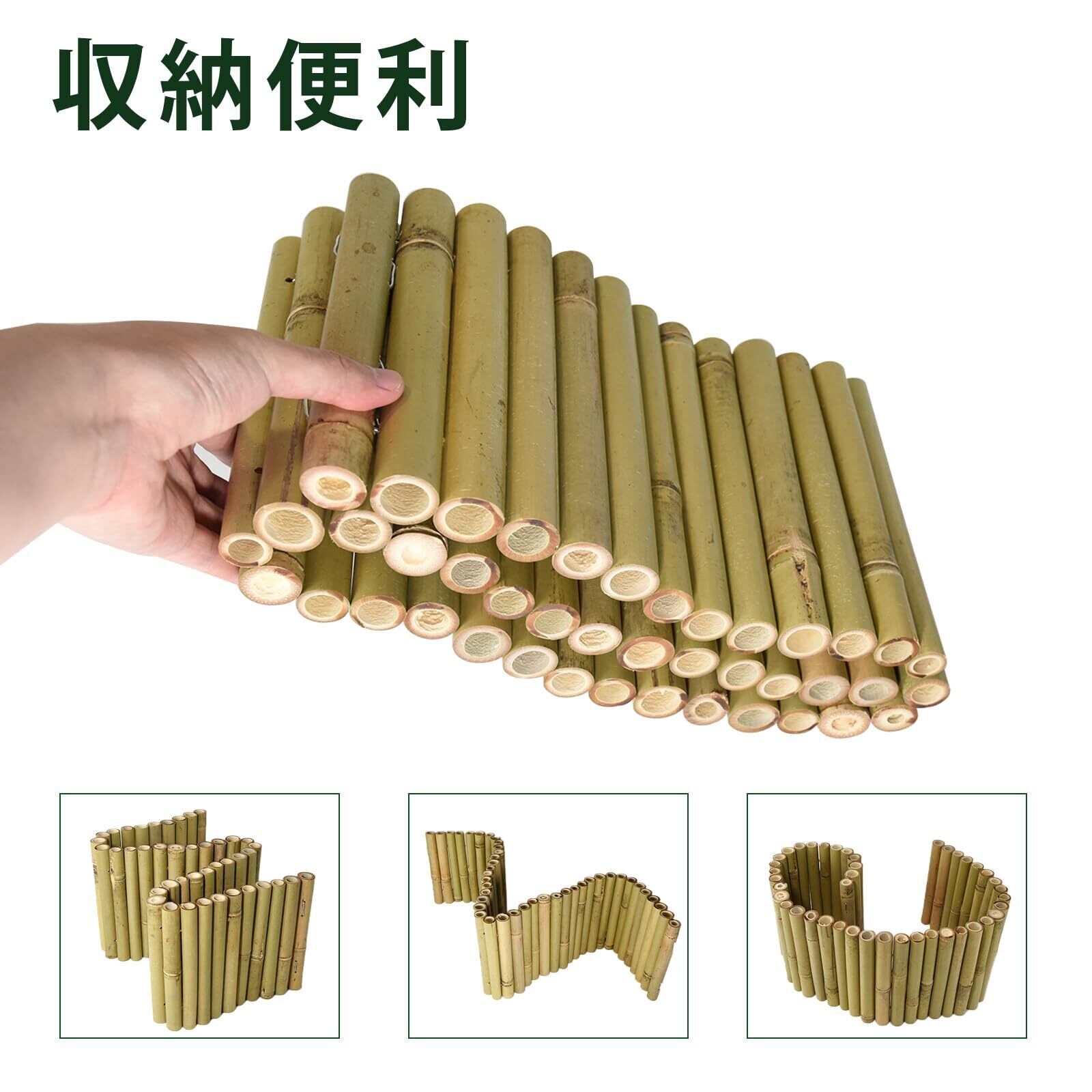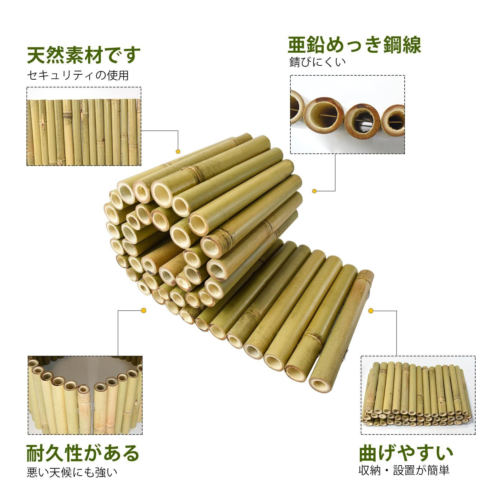 高い耐久性:この竹柵は柔軟と高い耐久性を持っており、壊れにくくて、お好みの形状に自由に設置できます。毎竹に亜鉛メッキされた材料で固定されています。悪天候でも錆びない素材です。