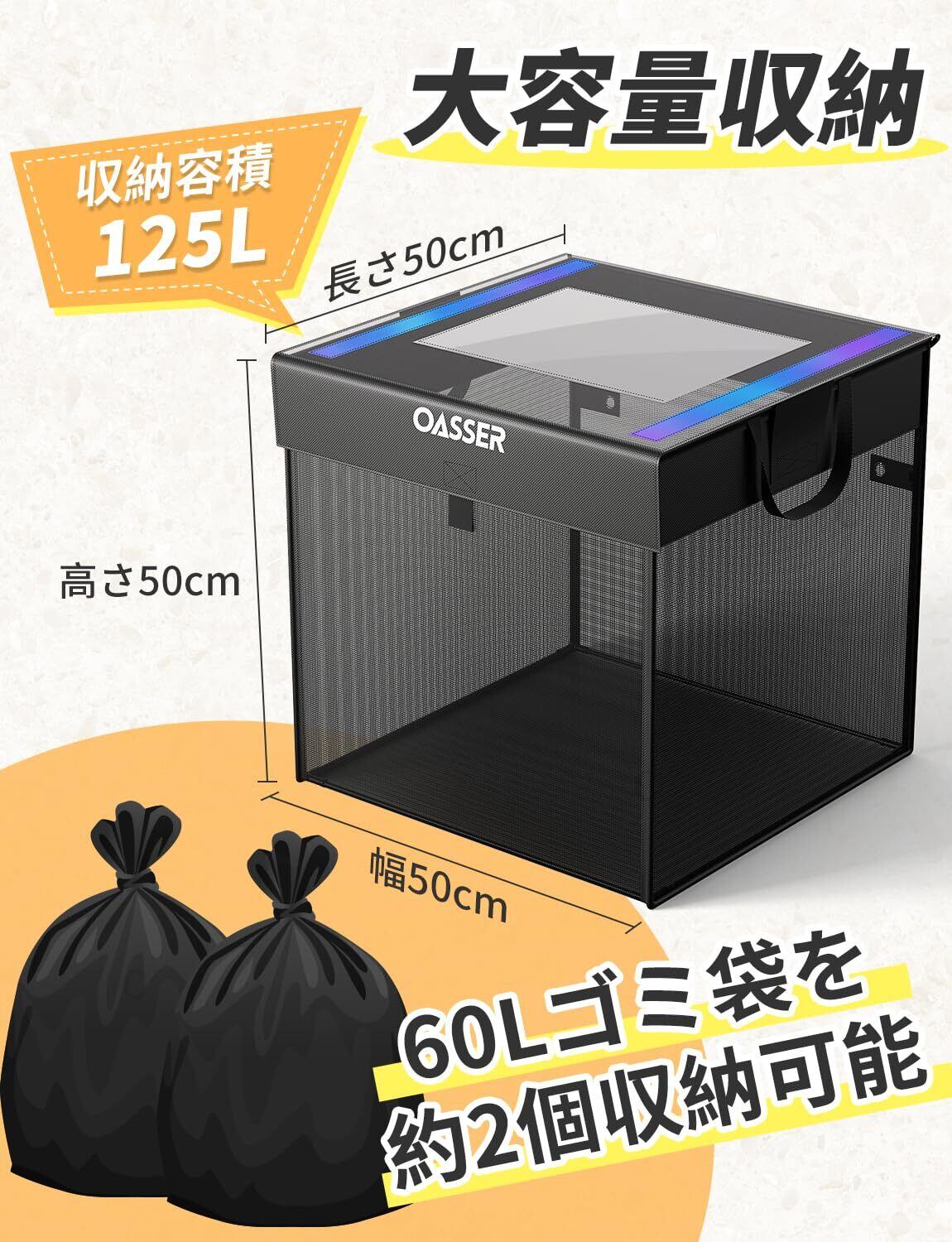 125L大容量カラス除けゴミネットボックス:サイズは横50×奥行50×高さ50cmです。60Lのゴミ袋がのゴミ袋が約2袋入ります。水洗いできるので、衛生的にご使用いただけます。
