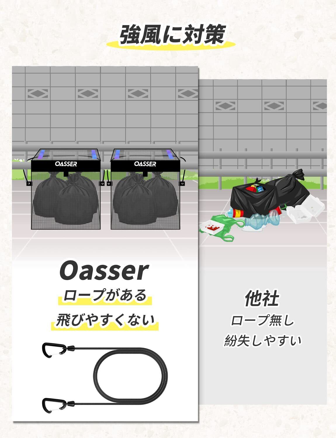強風対策:風に飛ばされないようゴミネットにハトメがついているので、付属のヒモを通してフェンスなどに固定可能です。丈夫なポリエステルメッシュ生地を採用し、屋外雨ざらしでも長く使えます。