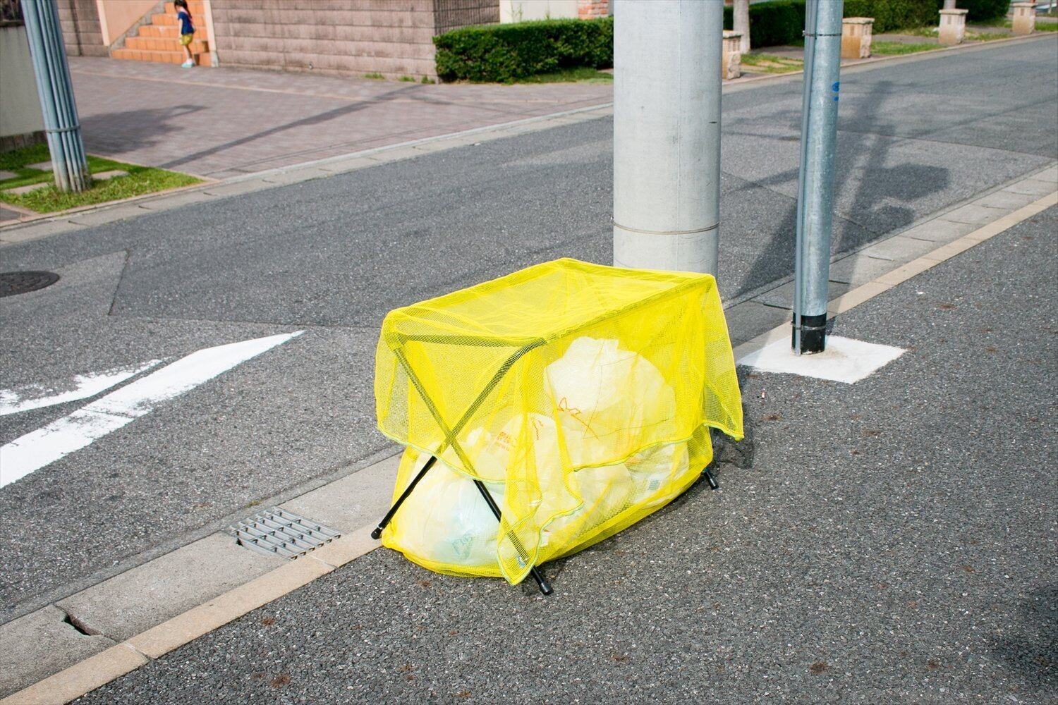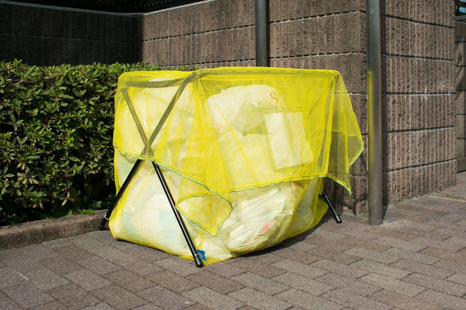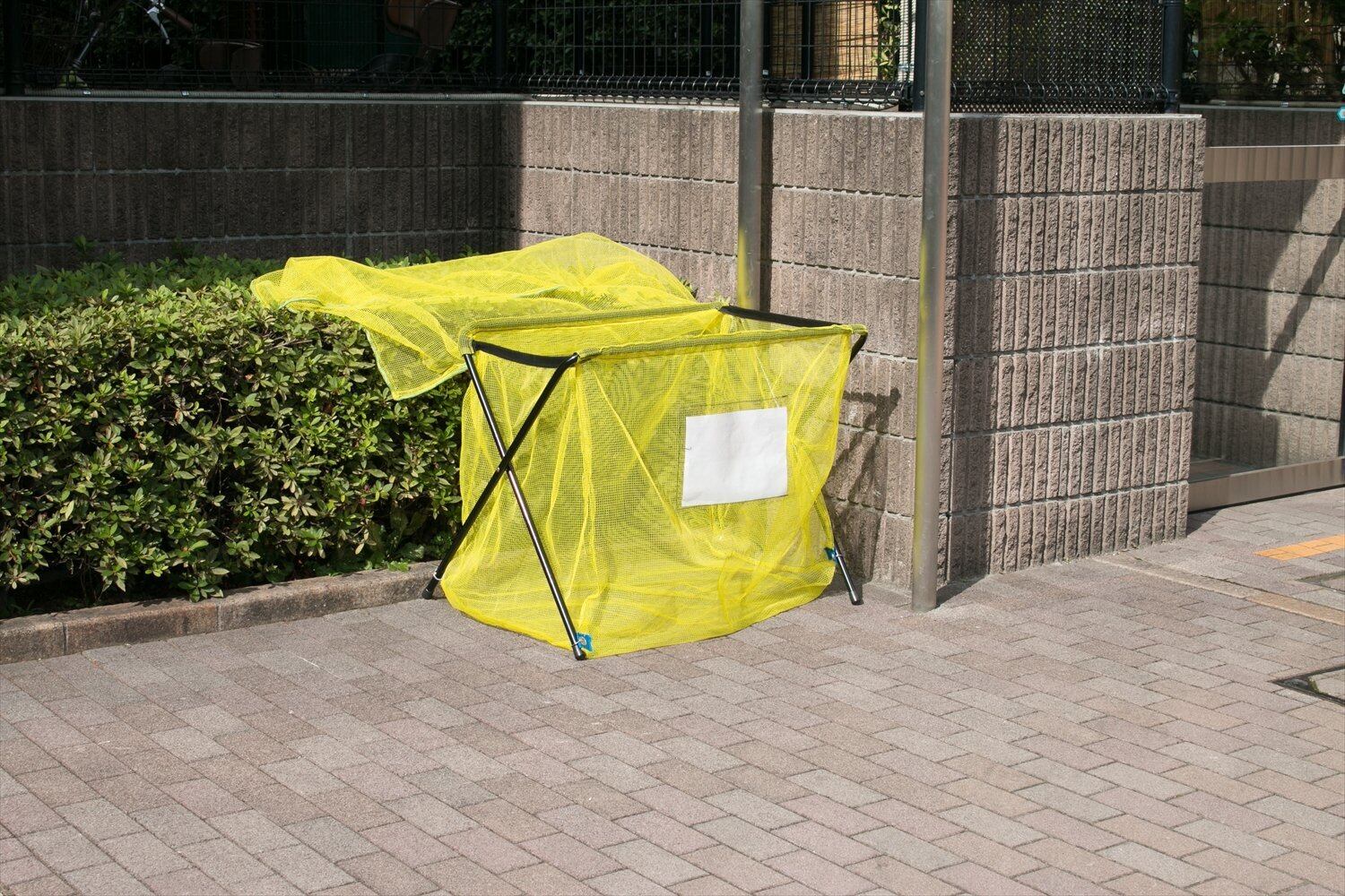 折り畳み式のゴミ回収用ネットスタンド。犬猫やカラスによる被害を軽減。