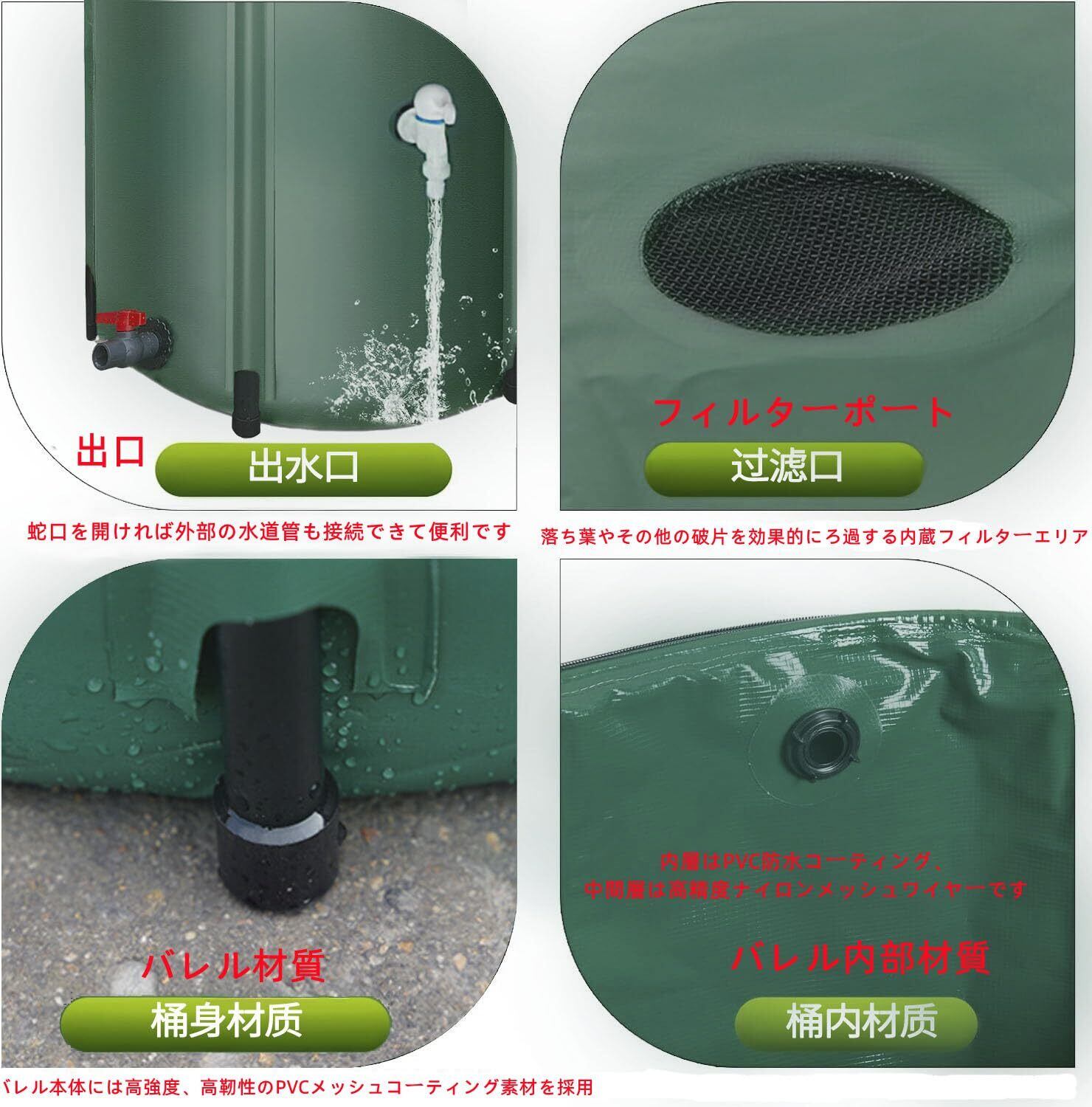 メッシュカバーのデザイン:このレインバレルは、簡単に保管および持ち運びできるように折りたたむことができます。さらに、その緑の表面はあなたの裏庭の光景に適しています。トップメッシュカバーは動物やがれきの侵入を防ぐために新しく設計されており、簡単に取り外し・分解が可能です。開口部が広く、タンク内部に直接手が届きやすいため、定期的な清掃やメンテナンスも手軽に行えます。砂や汚れ、藻類の除去も簡単で、常に清潔な状態を保つことができます。