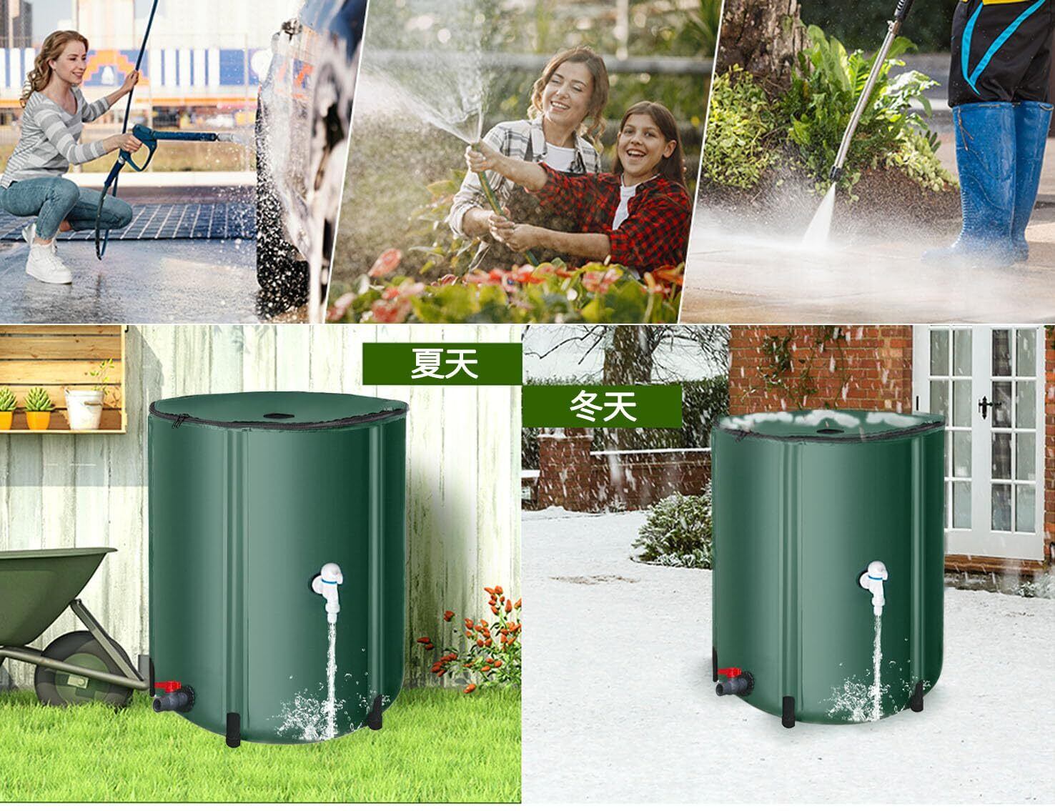 防災用品:地震などの地質災害が起きたとき、普段からこの雨水桶を使ってあらかじめ水を貯めておくと、災害時に貴重な水資源を得ることができます。バレル底部は安定性を高めた設計を採用しており、満水時や強風時でも倒れにくくなっています。