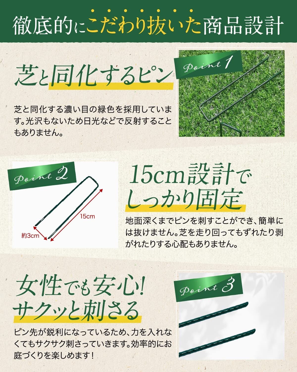 【お子さんが走り回っても安心】長さ15cmのピンが地面深くまで刺さりしっかりと固定してくれるため、小さなお子様が人工芝の上を走り回ってもずれたり外れたりせず安心してお庭で遊ぶことができます。また人工芝に同化する色を使って着色しているため目立ちません。美しく、安心な人工芝のお庭作りに最適です。