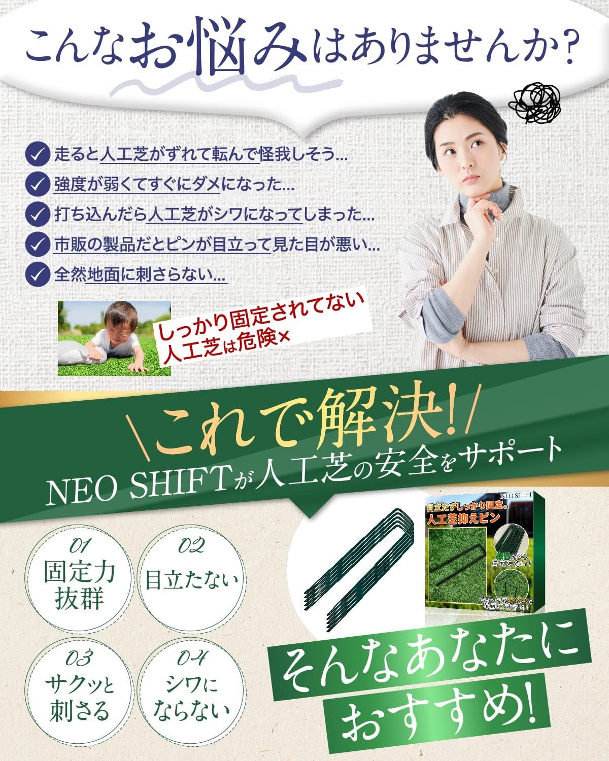 【耐久性があるため長持ち】安いだけでなく、特殊加工でサビを防ぎ長持ちします。何度も人工芝を手入れする必要がなく、美しさを維持したお庭を保ちます。 ピンを買い直してまた地面に打ち直し…ということがないように長くお使いいただけるよう本商品がサポートいたします。 【NEO SHIFTブランド正規品&手厚いサポート】では「プレミアムな品質を手軽に。」をコンセプトに商品企画、開発をしております。日本人だからこそできる高い検品基準、日本人によるアフターフォロー体制を整えています。