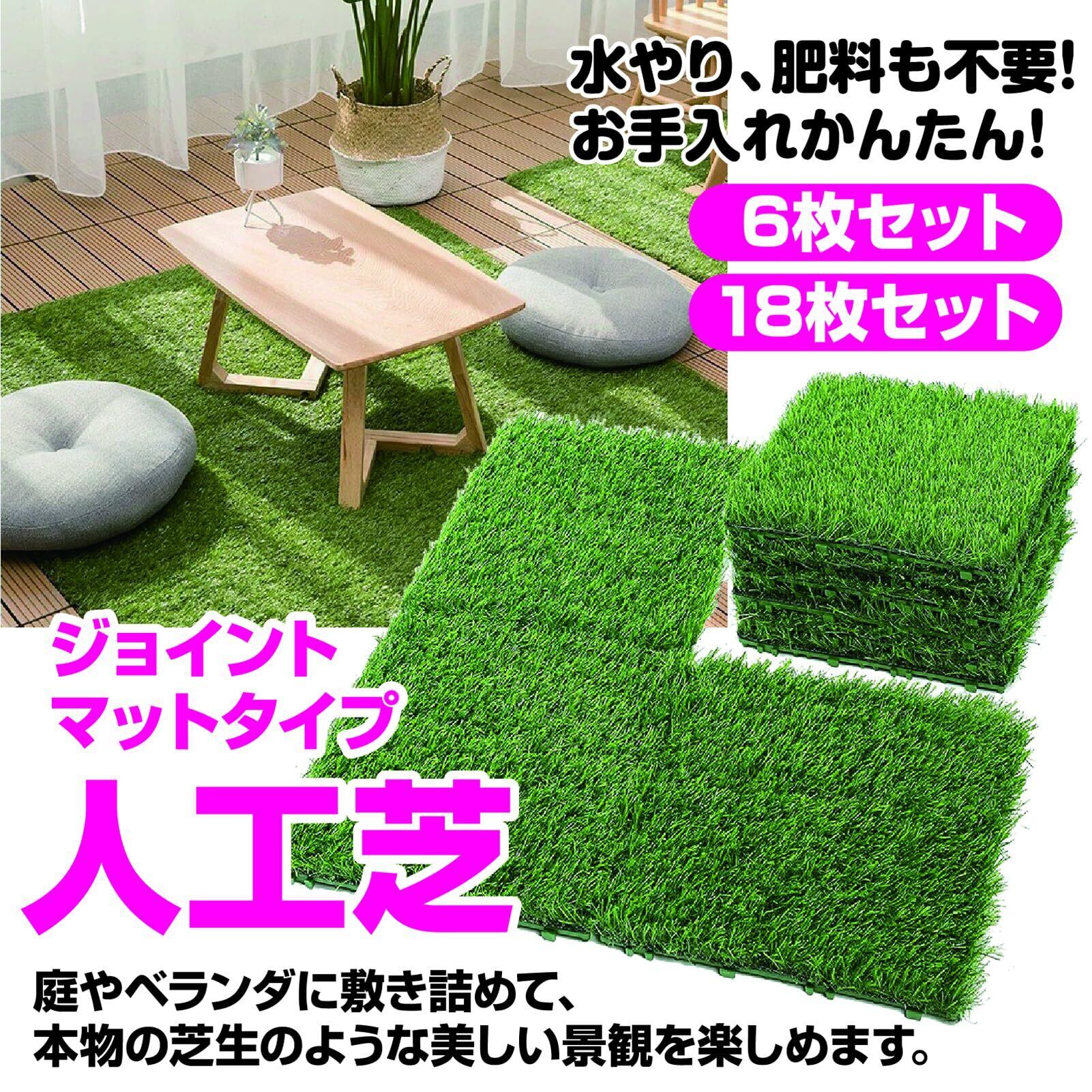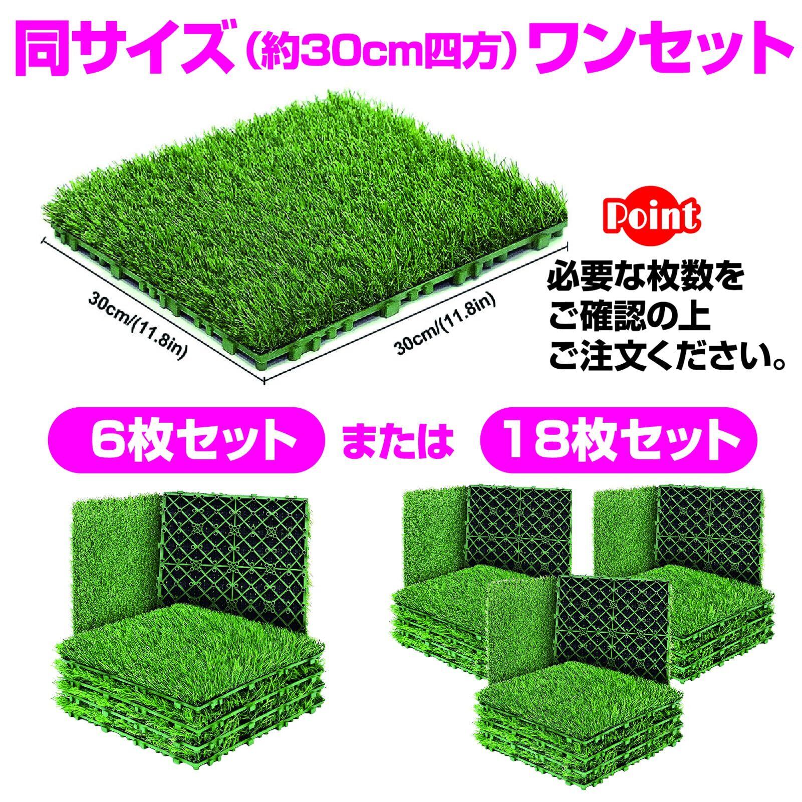 同じサイズ(約30cm四方)の人工芝を6枚セット、もしくは18枚セットでお届けいたします。必要な枚数をご確認の上ご注文ください。
