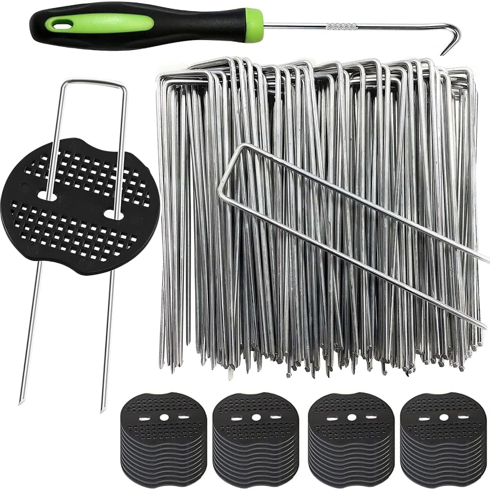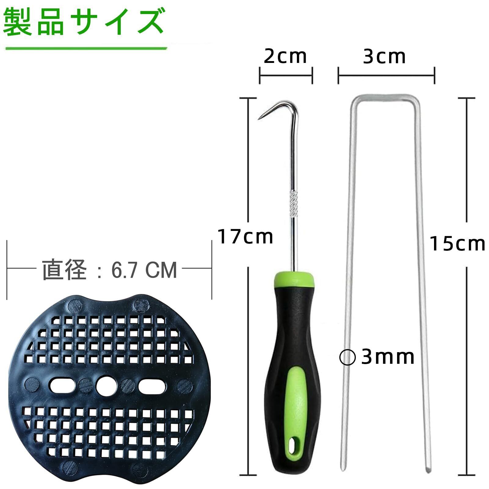 セット内容:U型釘杭:縦15センチx横2.5センチx直径約3ミリ、400個。黒い丸400個とフック1個とディスペンサー手袋も含まれています。