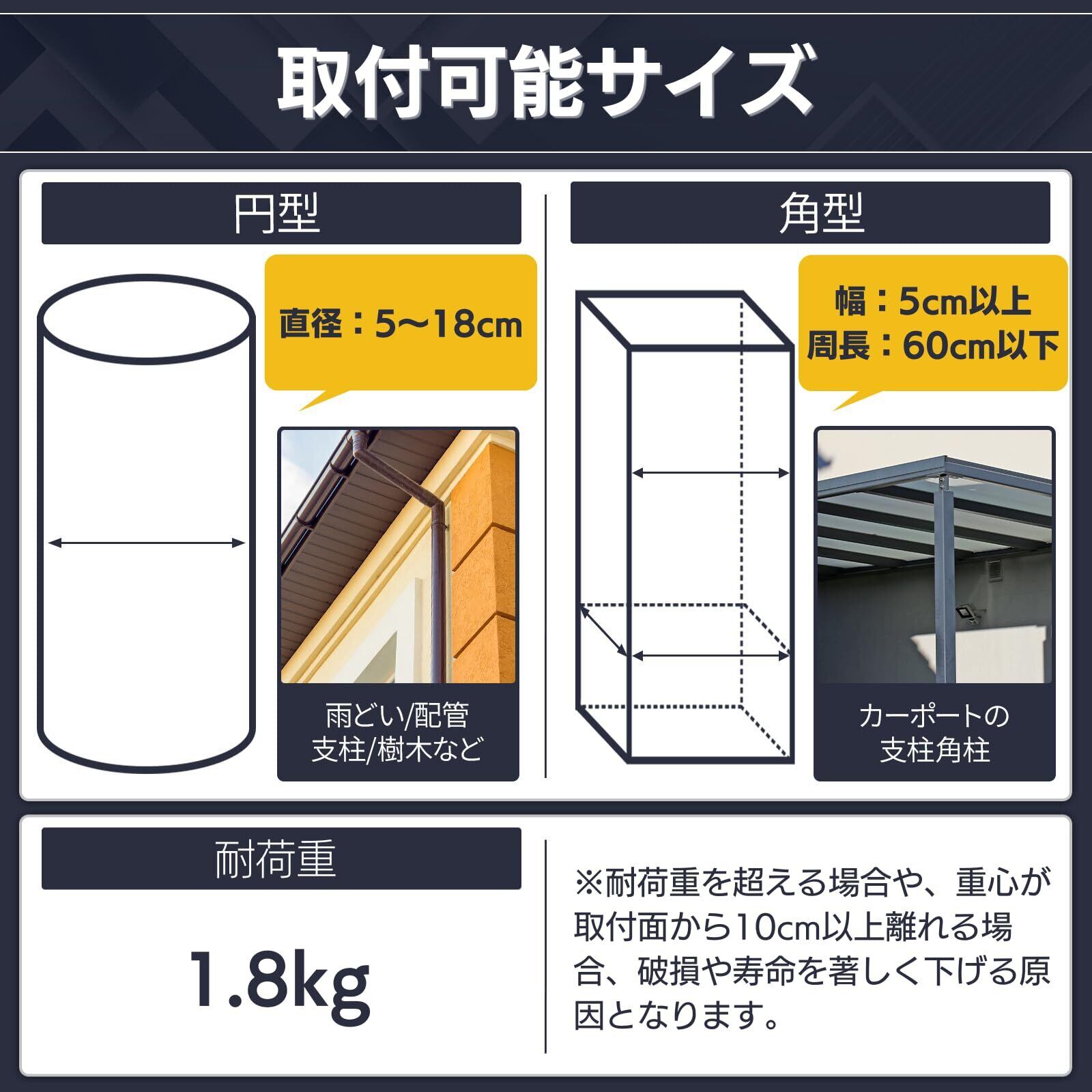 【幅広い『円型』に対応】雨どい/配管/樹木など円型で、直径5~18cmと幅広いサイズにフィットしガタつかない