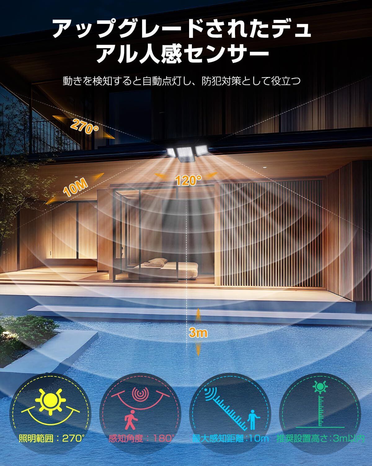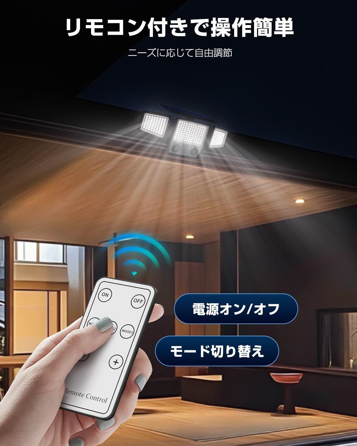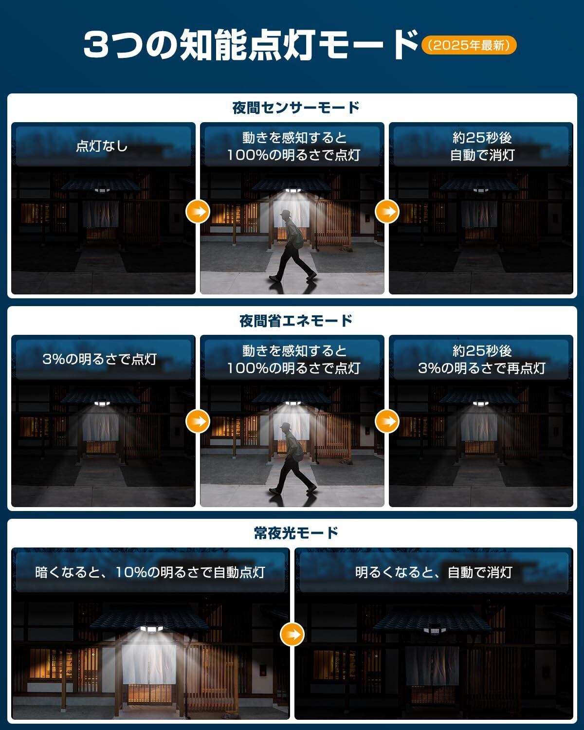 【3つの点灯モード・リモコン操作可能】センサーライト 屋外は配線不要、コンセントから給電する必要がなく、好きな場所に自由に設置できます。付属のリモコンで簡単に3つのモードを切り替えられます。● 夜間センサーモード :人や動物、車の動きを感知すると自動的に高輝度100%で点灯し、動きがなくなると約25秒後に自動で消灯。● 常夜光モード:周囲が暗くなると、自動的に輝度10%で点灯し、周囲が明るくなると自動消灯します。● 夜間省エネモード:暗くなると低輝度3%で点灯し、動きを感知すると自動高輝度100%に切り替わり、動きがなくなる約25秒後に低輝度3%に戻ります。