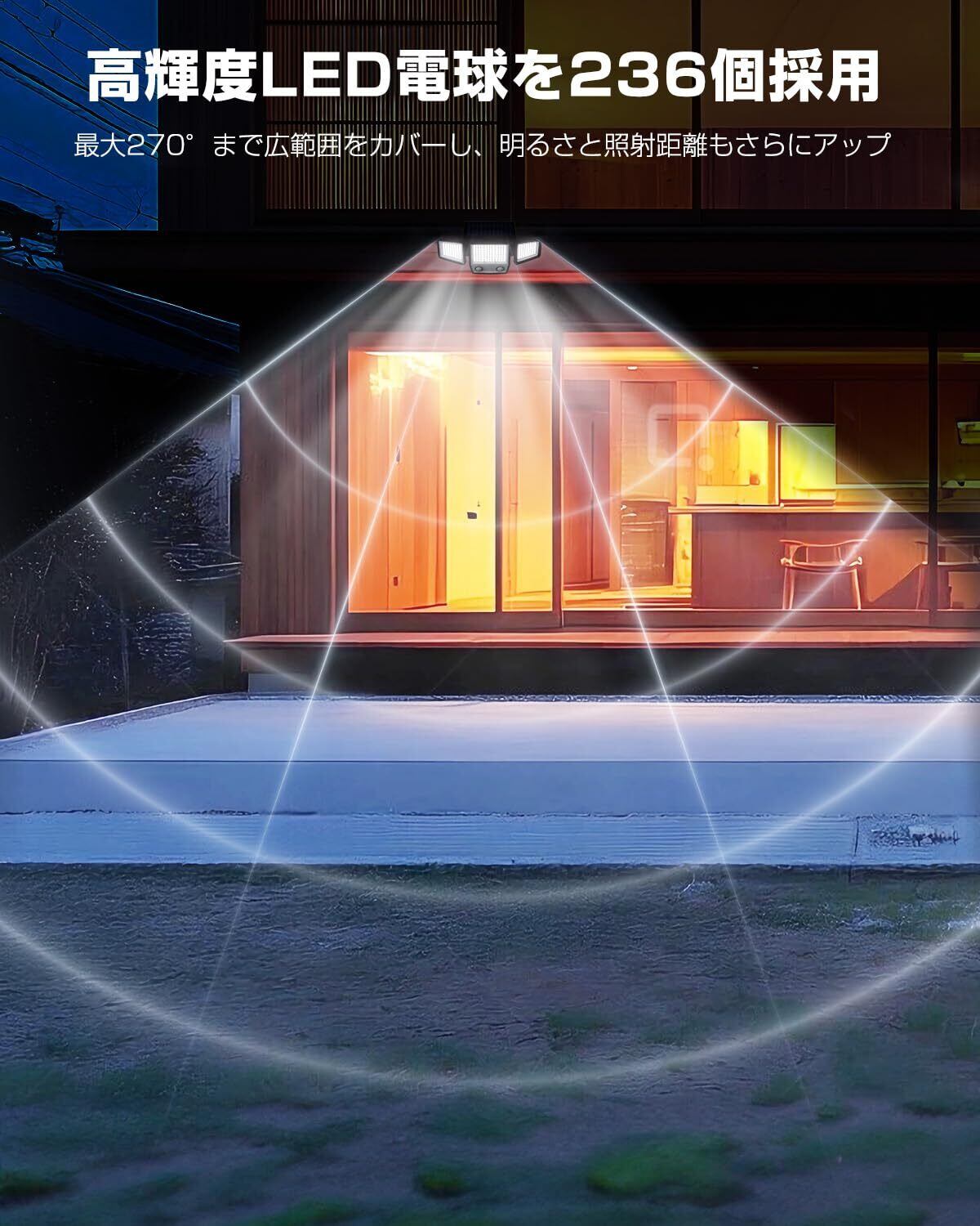 【高輝度236個LEDランプ・広角270°照明】236個の7500K昼光色超高輝度LEDランプを採用し、照明効果に優れて、光の死角はほとんどなくなります。3面照明デザインにより照射角約270°で広い範囲を照らし、超拡散な明るさを実現しました。2側のライトは上下左右に自由に回転可能で、お好きな照射方向によって自由自在に変えられます。