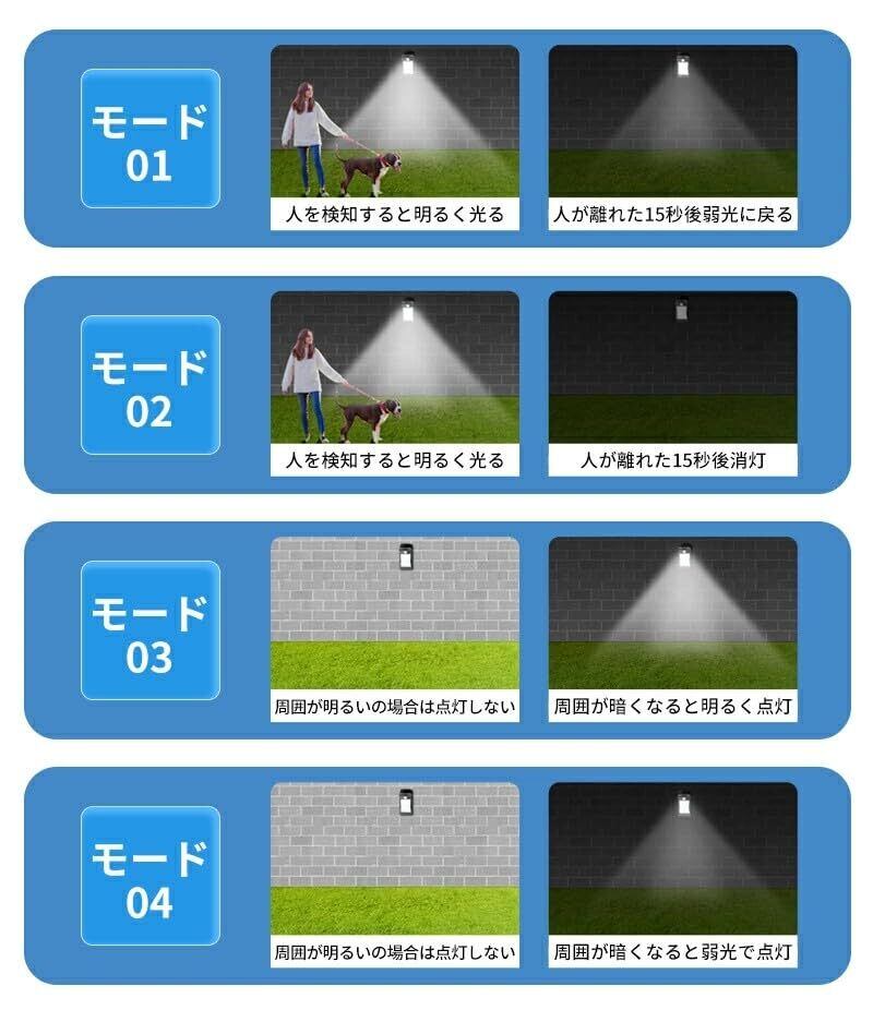 【スマートな人感センサー&4つ点灯モード】ボタン1回押して、72LEDセンサーライトは常夜灯+人感モードの4つモードが切り替えます。人感センサーで、暗くなる時人が通ると強力に自動発光します。