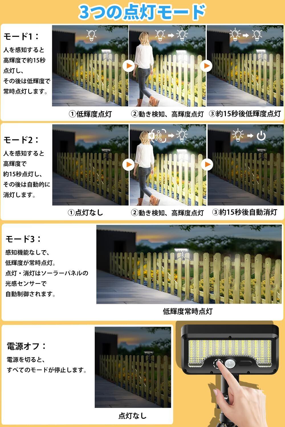 【3つの感知モード・IP65防水】お客様の使用シーンや目的に応じて3つの感知モードを搭載したソーラーセンサーライトです。(1) 人感センサーモード: センサーが人や動きを感知した時だけ強力に15秒間点灯し、人が去ると微灯状態。防犯性と省エネ性を両立します。(2) 省エネモード: 周囲が暗い状態でのみ、人を感知すると明るく点灯(15秒間)、人が去ると消灯。最も省電力で、必要な時だけ確実に明かりを灯すスマートモードです。(3) 明暗センサーモード: 周囲が暗くなると自動的に点灯し、明るくなると消灯。感知機能はオフで、ほのかな明るさを一晩中提供し、庭や通路の安全なナビゲーションや雰囲気作りに最適です。さらに、IP65防水防塵仕様を取得。強い雨風やほこり、粉塵にも耐え、過酷な屋外環境でも確実に動作。梅雨の長雨や豪雪地域、水しぶきの多い駐車場など、日本の厳しい気候条件でも安心してお使いいただける耐久性を備えた ソーラーライトです。