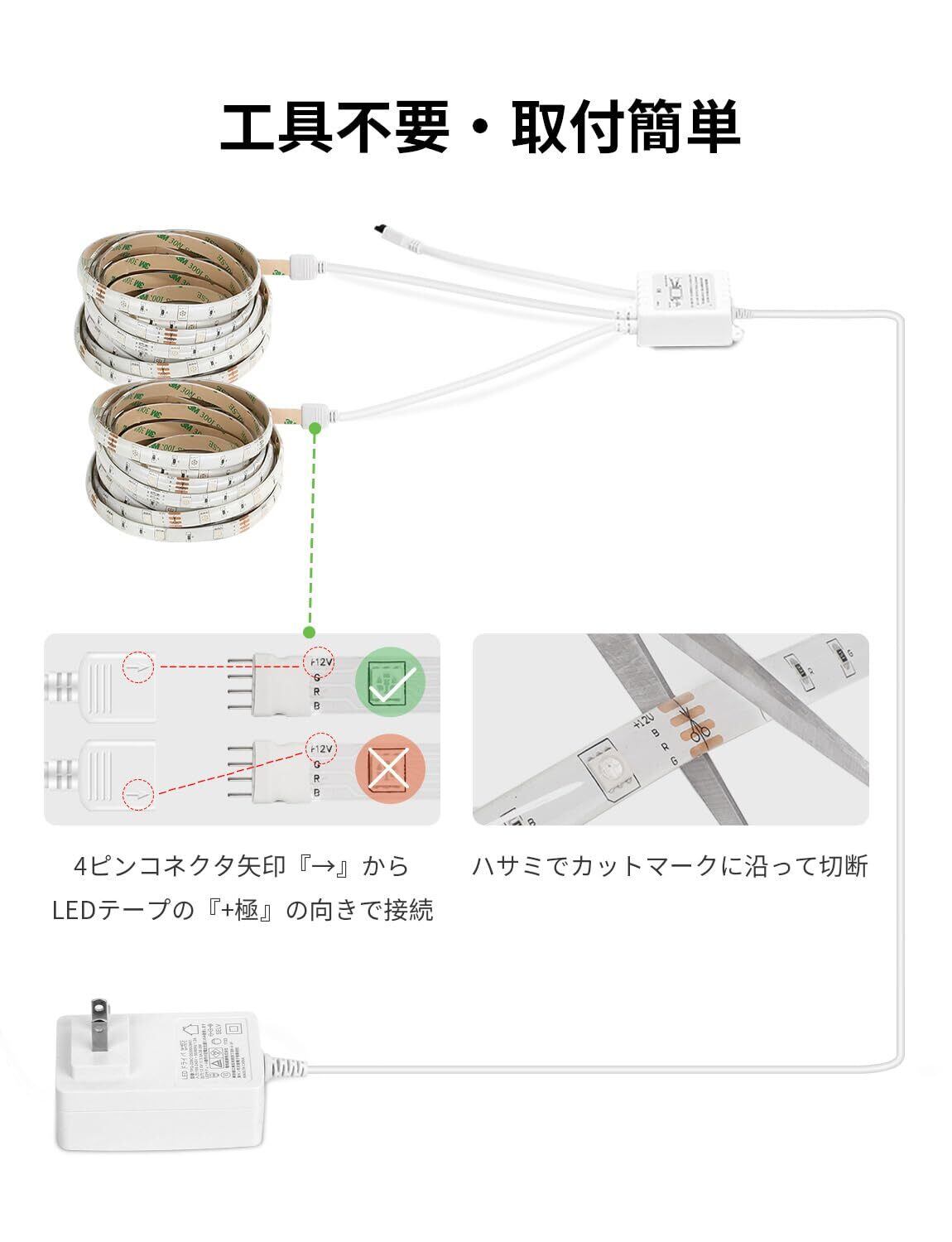 ご注意:●該当製品の長さは10mです。他のテープライトと連結して使用しないでください。電力オーバーしてしまうと、不良の原因となります。●『初使用時、テープライト本体を全展開して、設置場所に貼ってから電源に接続してください。リールに巻かれた状態で、電源に接続すると発熱し故障の原因になります。』
