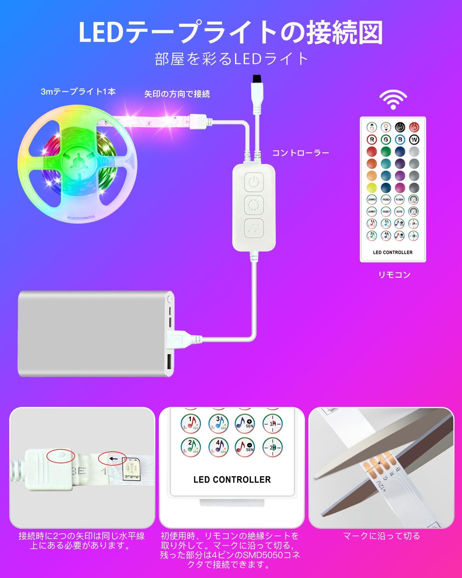 【テープライトパッケージ内容】LEDテープライト×1(3m)、コントローラx 1、リモコンx 1、日本語取扱説明書x 1。弊店は、安心・安全なショッピング体験をさせていくために、一年間のサービスを提供しております。(何かご質問がありましたら、24時間以内に解決でき、お気軽にお問い合わせください。)
