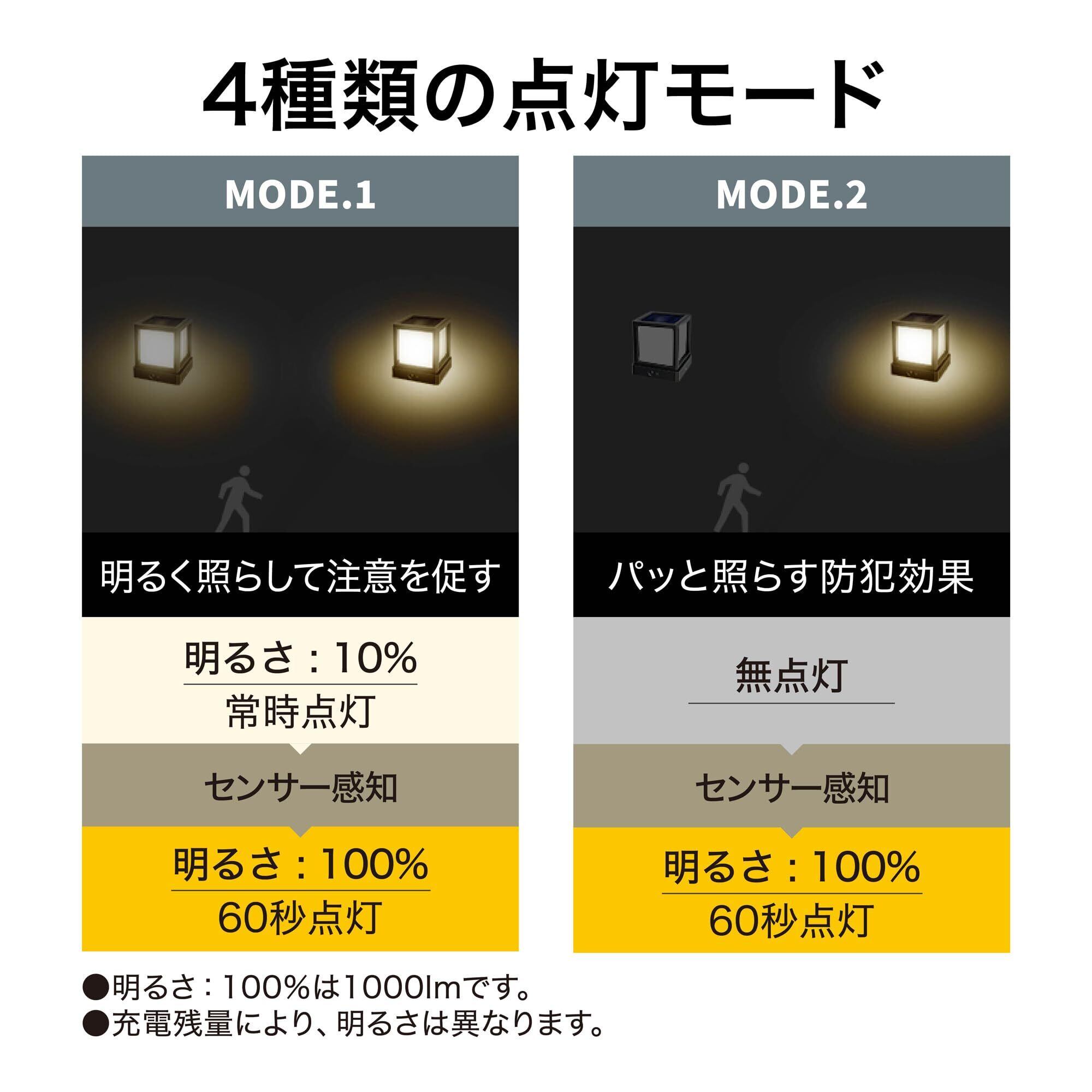 02 目的に合せて選べる点灯モード切り替え。例)CUBE MODE.2 明るさ:10% 連続点灯ンセンサー感知。明るさ:100%点灯時間:30秒。【点灯モードお知らせ機能】モード切り替え操作のあと、ライトが点滅します。点滅した回数で『点灯モード』が分かります。