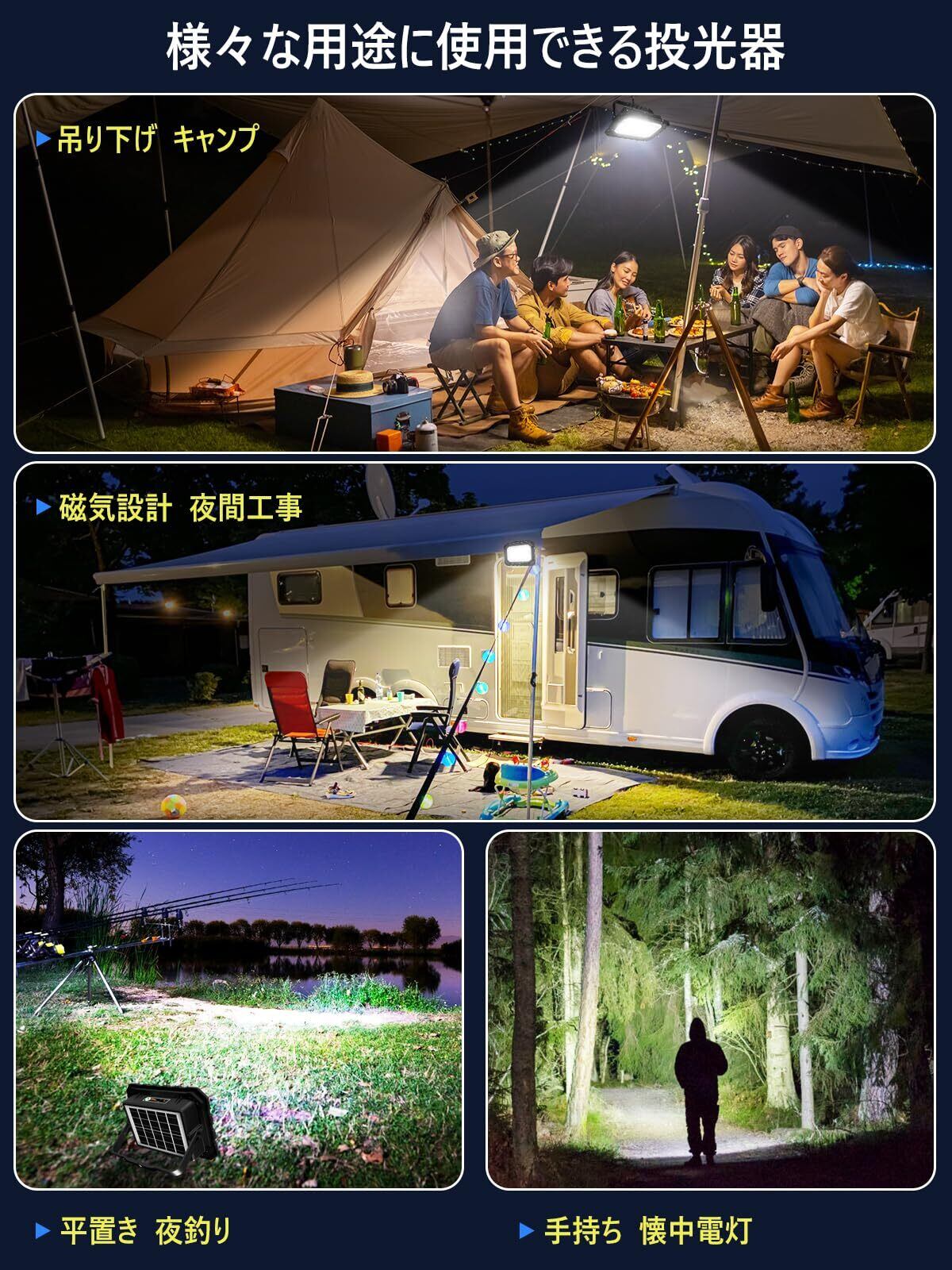 【180°角度調整可能&SOSモード&幅広い使用範囲】このフラッドライトには180°調整可能なU字型ブラケットが付いており、ニーズに応じて調整でき、吊り下げたり、平らな面に置いたり、ポータブルなどに使用でき、多機能なフラッドライトです。緊急時には、SOS警告灯としても使用できる投光器で、赤と青の点滅モードがあり、いつでも持ち運べる屋外照明の作業灯として特に最適です。そして、この作業灯は夜釣り、バーベキュー、車中泊、キャンプ、夜間工事、作業灯、台風/地震/停電対策、アウトドア、登山、屋外照明、防災、緊急時などにも大活躍です。
