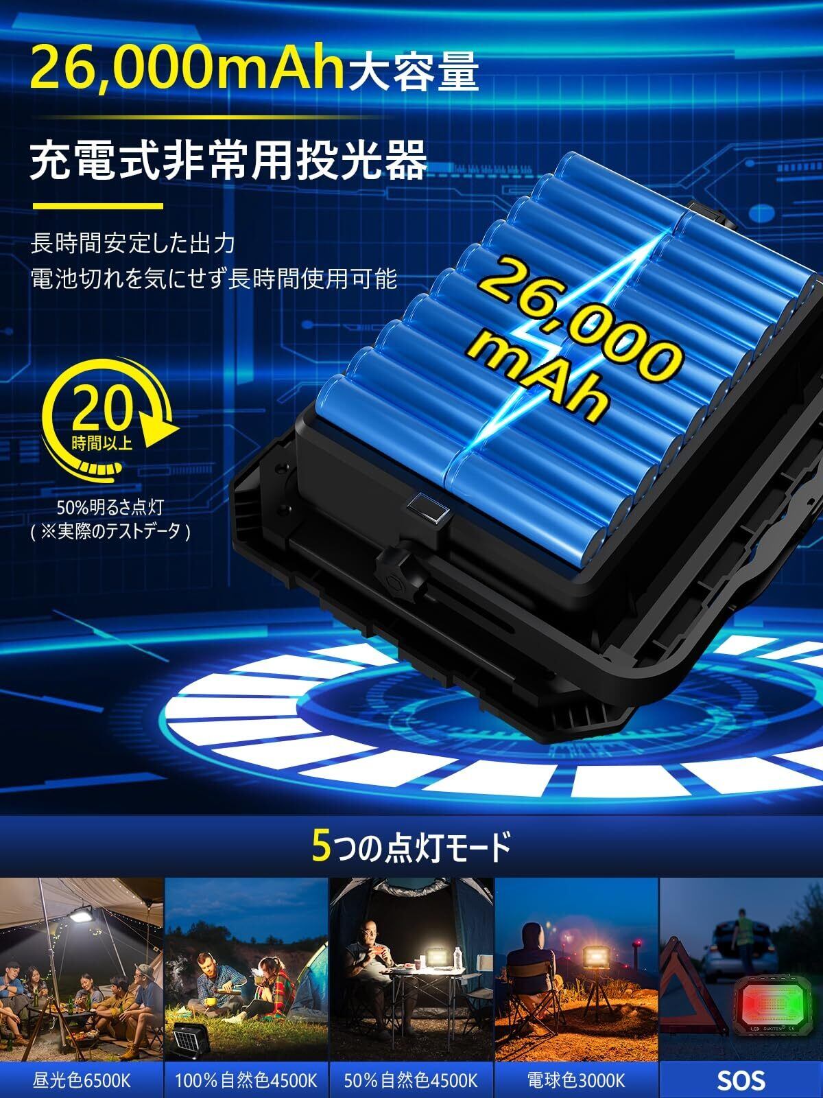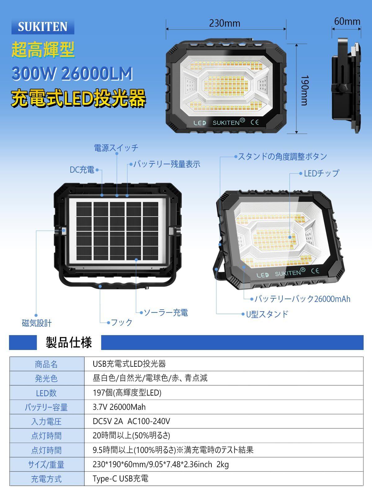 【2025アップグレード】SUKITEN 投光器 充電式 led 屋外 作業灯 300W 26,000lm 26,000mAH大容量 IPX4防水 超高輝 ワークライト 5つ点灯モード 便携式 磁気設計 キャンプ アウトドア 登山 夜釣り 防災 緊急 停電対策 屋外照明 夜間工事