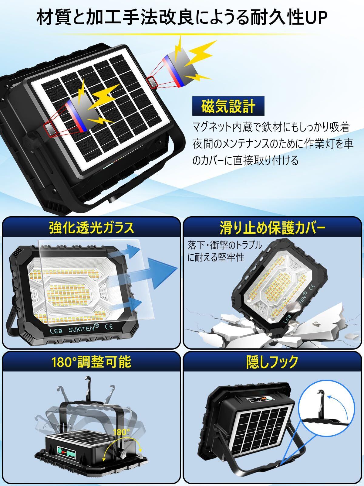 【2025アップグレード】SUKITEN 投光器 充電式 led 屋外 作業灯 300W 26,000lm 26,000mAH大容量 IPX4防水 超高輝 ワークライト 5つ点灯モード 便携式 磁気設計 キャンプ アウトドア 登山 夜釣り 防災 緊急 停電対策 屋外照明 夜間工事 | KSショップ