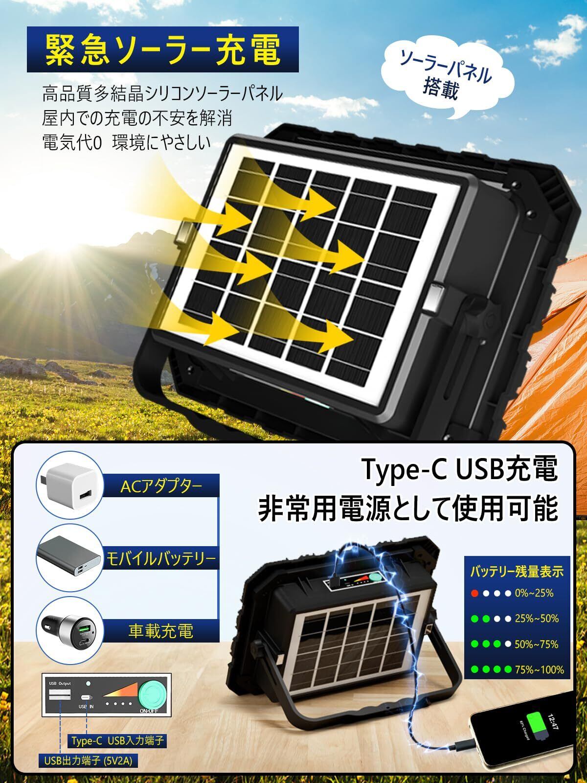 【100%明るさで9.5時間点灯&26000mAh大容量バッテリー】本充電式作業灯は26,000mAh超大容量バッテリーを内蔵しており、50%自然色モードで20時間以上、100%自然色モードで12時間以上使用可能です。充電機能付き、従来品2倍の充電効率で、充電時間を半分に短縮します。さらに、ソーラー充電パネルとType-c USB充電モードも備えています。屋外でも充電を気にせず使用できる作業灯で、バッテリー残量表示灯も付いており、投光器のバッテリー残量が一目でわかるので、より安心してご使用いただけます。ACアダプター、PC、モバイルバッテリー、車載充電、ポータブル電源などのUSB充電モードです。