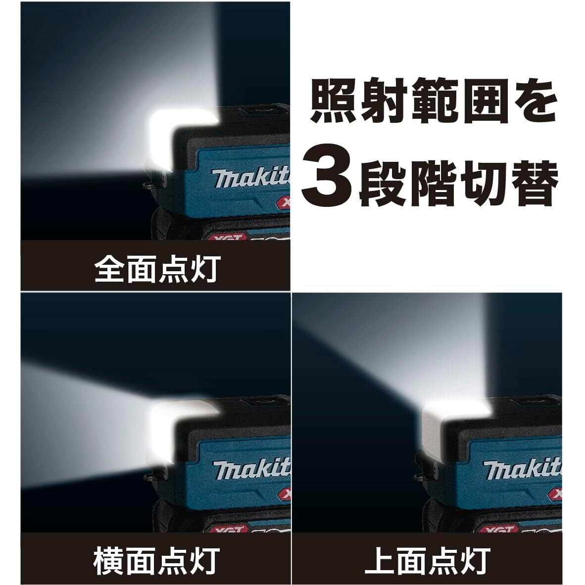 広範囲照射&コンパクトサイズ。USB出力付、18V/14.4Vモデル。照射範囲切替可能。ライトスイッチを押すたびに全面点灯・横面点灯・上面点灯・電源OFFと切替が可能。電源OFF時に前回の照射モードを記憶するメモリ機能も搭載。
