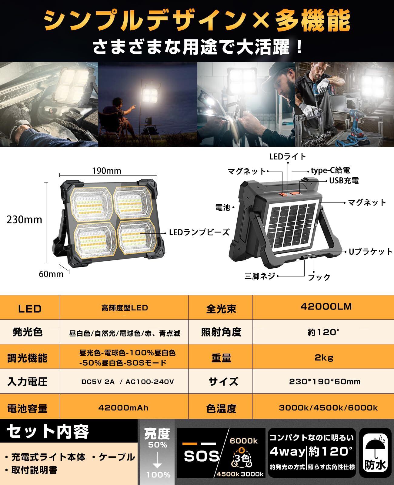 【42000mAh大容量バッテリー・最大30時間連続使用が可能】新世代のLEDライトは使用寿命500,00時間以上に達し、周囲の暗闇を切り開き、夜間であっても昼間のように感じられます。サイズ:Φ230*190*60mm 重量:約2kg(単品) 42000mAh大容量リチウムバッテリーを内蔵しており、電池の手間が無し。50%自然色モードで25時間以上、100%自然色モードで15時間連続使用可能!フル充電後、最大約25時間の連続稼働ができます(乾電池次第)。また、USB充電式なので、ACアダプター、モバイルバッテリーなどを利用し、手軽に充電ができます。充電して何回も使える充電式は、環境への 負荷を抑えることができるからです。充電式 led投光器としては、どこでも楽々で持ち運びやすくて、充電が長持ちで週末一泊二日のアウトドア用も安心して使えます。注意事項:ご使用前に完全に充電してください。