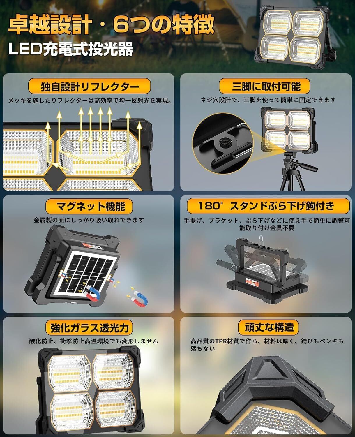 【42000LM超高輝度LED投光器・4つの反射板転換効率UP】投射された光束の明るさは完全に同じタイプの投光器を超えて、実際の照明輝度は42000ルーメンに達し、暗闇を簡単に突破し、夜間を昼間のように感じます。慎重に配置された 4つの反射パネルにより、光があらゆる方向に最適に分散され、照明の死角がなくなります。また、高度な光学レンズ設計を使用して、各反射プレートが光を集束します。光の透過性を高めながら光の損失を低減し、長距離投影でも高い輝度と明瞭な光と影の境界を維持します。18%高転換效率単結晶シリコンでソーラーパネルの搭戴により、パネルに照射された太陽光エネルギーを効率よく電気エネルギーにできるため、晴天の多くのアウトドア環境で使用される場合は、頻繁に充電する必要もなく点灯し続けられる世になりました。75%以上の電気代を節約出来ます。注意:ライトの切り替え中は目を守るために、オンする時に光源を直視しないでください。