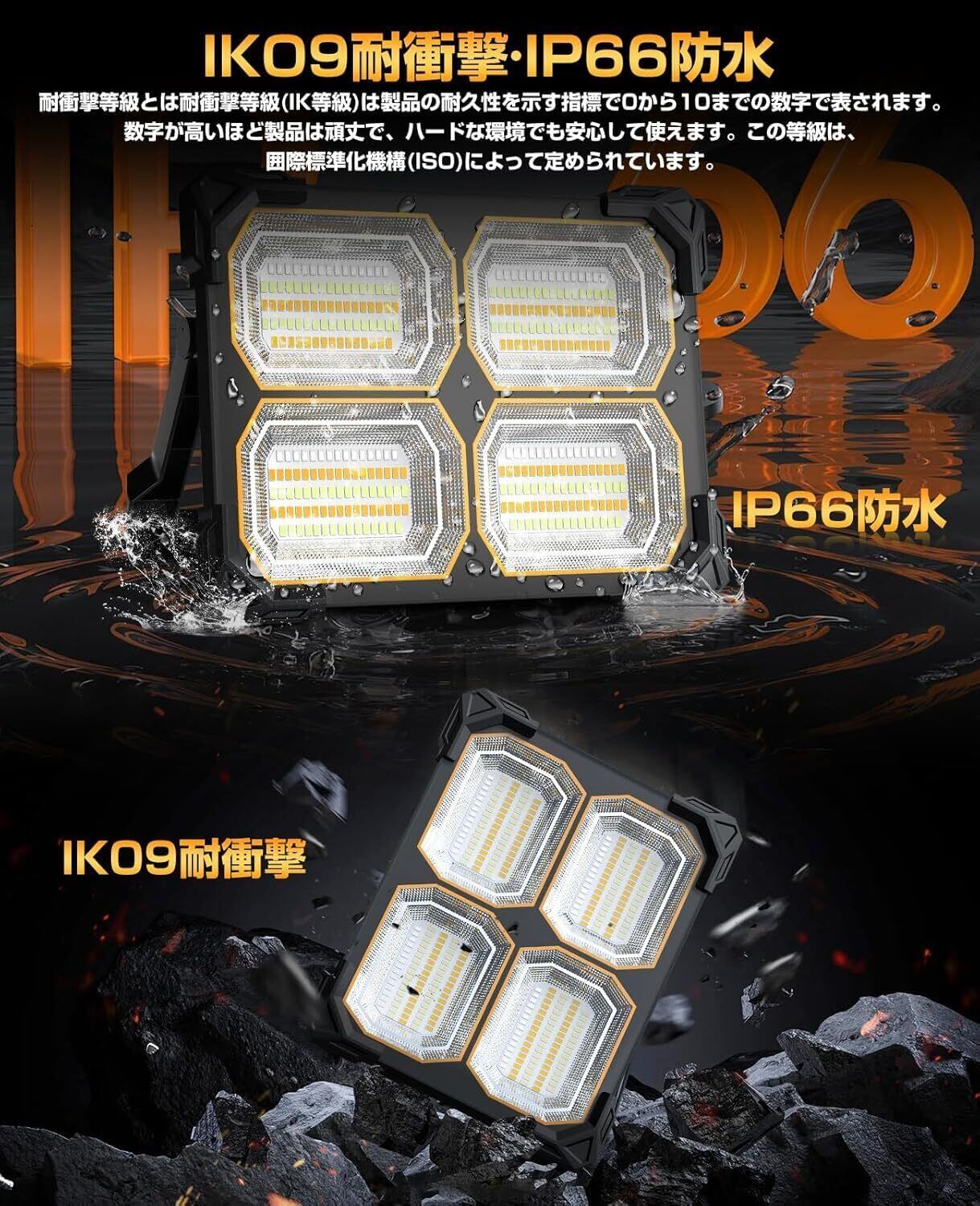 【IKO9耐衝撃・IP66防水・頑丈な構造・高性能放熱設計】耐衝撃等級とは耐衝撃等級(IK等級)は製品の耐久性を示す指標で0から10までの数字で表されます。数字が高いほど製品は頑丈で、ハードな環境でも安心して使えます。この等級は、囲際標準化機構(ISO)によって定められています。TANKAOのLED投光器は強化超透明ガラスと滑り止め保護カバーを採用しており、防爆、耐圧、高温耐性があり、光透過率が大幅に向上し、光効果が向上し、落下や衝撃にも耐える耐久性を備えています。サメのエラを模したスマート放熱設計を組み合わせて、迅速で効率的な放熱をしします。これにより、過酷な屋外環境においても、良好な性能と長寿命をします。雨や雪の日でも正常に使用できます(水に浸さないでください)。