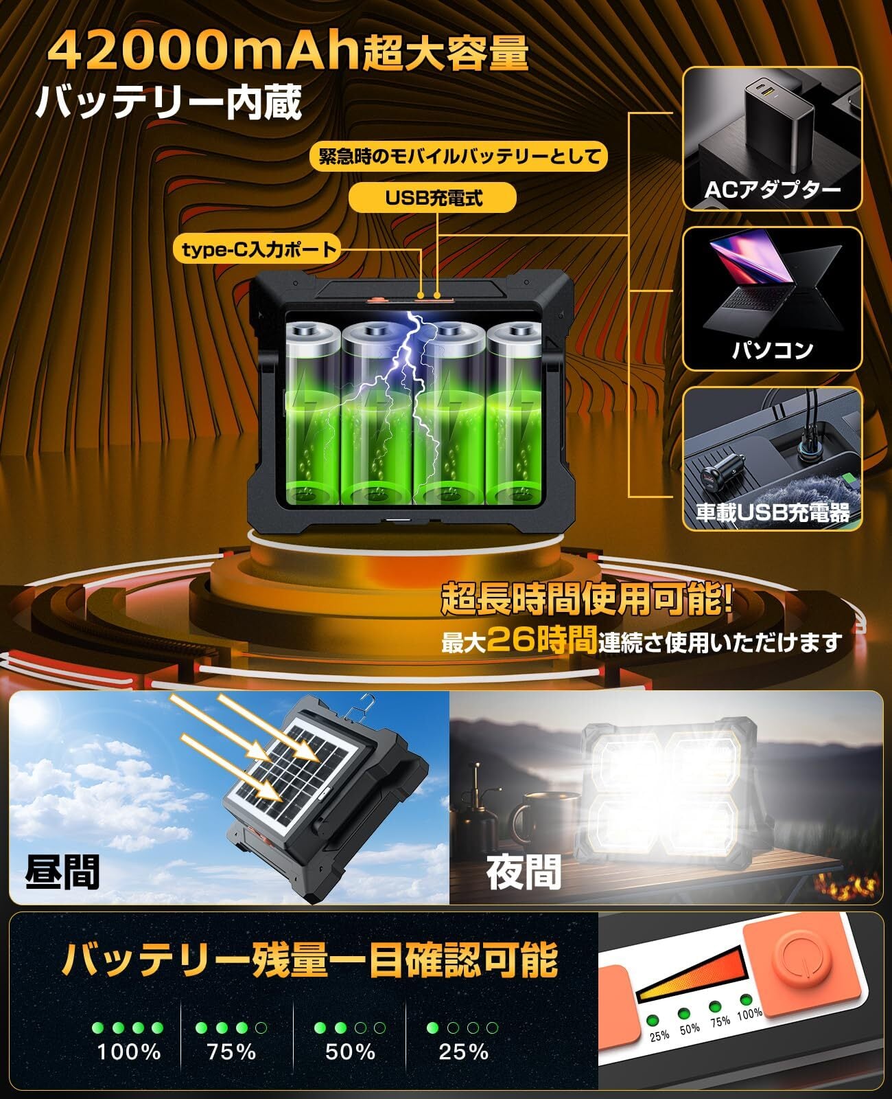 【TYPE-C充電式双方向/ソーラー充電・バッテリー残量表示】2つの充電モード、ポリシリコンソーラー充電パネル、屋外に電力がない場合、緊急ソーラー充電を使用できます。 5つのライトモード:昼光色、電球色、100%自然色、50%自然色、赤青点滅(SOS)モードが整備されています。最新版LED投光器は、電気出力を備えスマホはもちろん、パソコンやほかの外部機器に充電を行うことができ、モバイルバッテリーとしても活躍します。内部の充電池は42000mAhの超大容量で通常のスマホを最大4回充電可能です。電池残量表示ランプが付いており、電源が急に切れる心配はありません。フル充電の場合、最小モードで約25時間の連続使用ができ、最大モードでも約15時間の連続使用ができます。容量は普通の電池の2倍で、航続時間はもっと長いです、突然の停電など非常時や充電が難しい場合にも安心です。