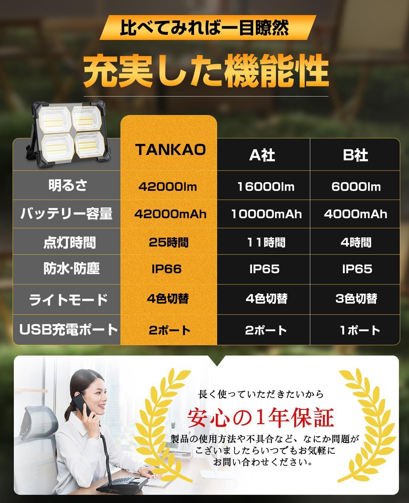 【極高輝・点灯15~30時間】TANKAO 投光器 充電式 led 作業灯 500W 明るさ42000ルーメン 屋外 超高輝 42000mAh大容量電池 残量表示 5種類点灯モード 最強 ワークライト 耐塵耐水 便携式 太陽光発電 磁気設計 キャンプ アウトドア 登山 夜釣り 夜間訓練 作業用 停電 防災 地震 避難対策 (500W) | KSショップ