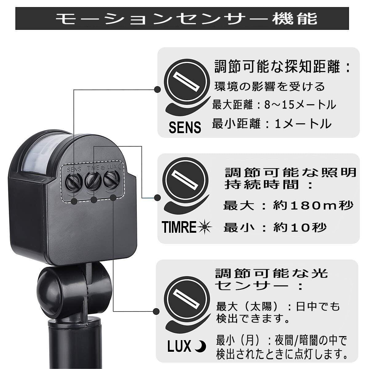 【機能】:PIRモーションセンサー送信機検知範囲(0-12m)、調整可能照明時間(10~360秒)2つのモード(昼と夜)があり、柔軟モードは自由に調整できます。
