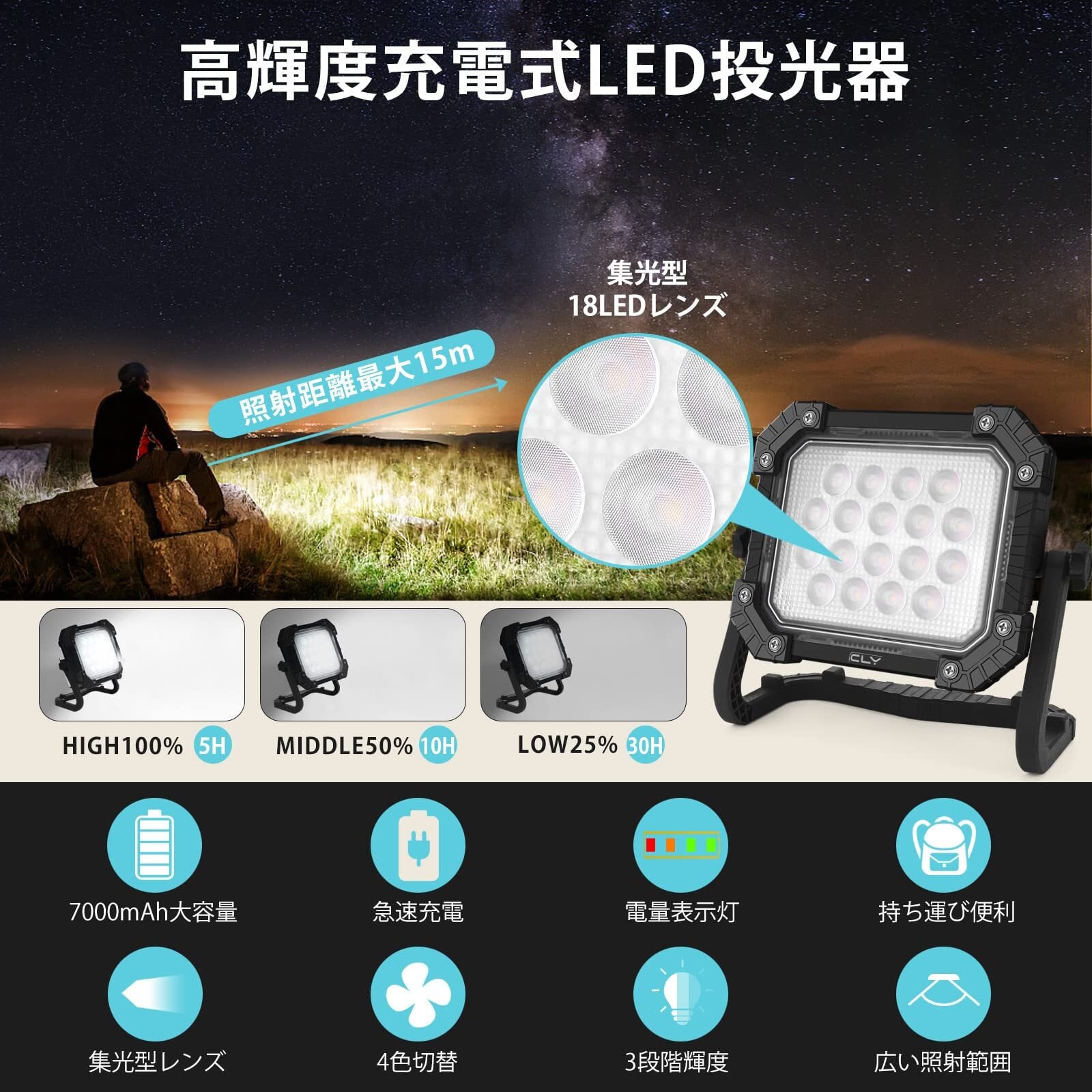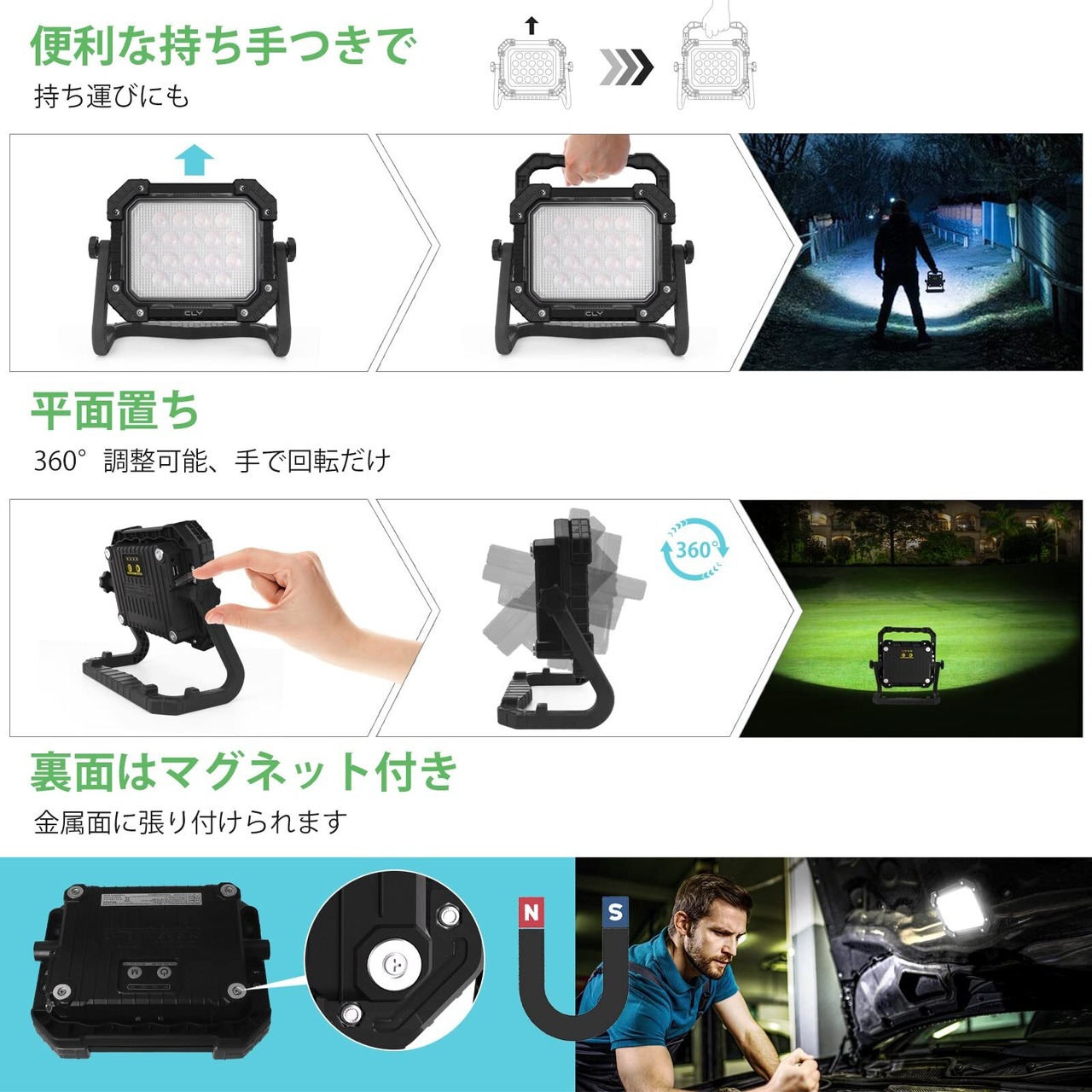 CLY LED 作業灯 投光器 ランタン 充電式 昼光色 自然色 電球色 SOS点灯 4色切替・3段階調光 高輝度 200Wより明るい マグネット搭載 ポータブル ワークライト フラッドライト フラッシュ 防塵・防水仕様 夜間作業/夜釣り/集魚灯/アウトドア/緊急用/防災用品/停電時用/非常用/災害グッズ/車修理用/ガレージ用 応急 照明 日本語説明書付き | KSショップ