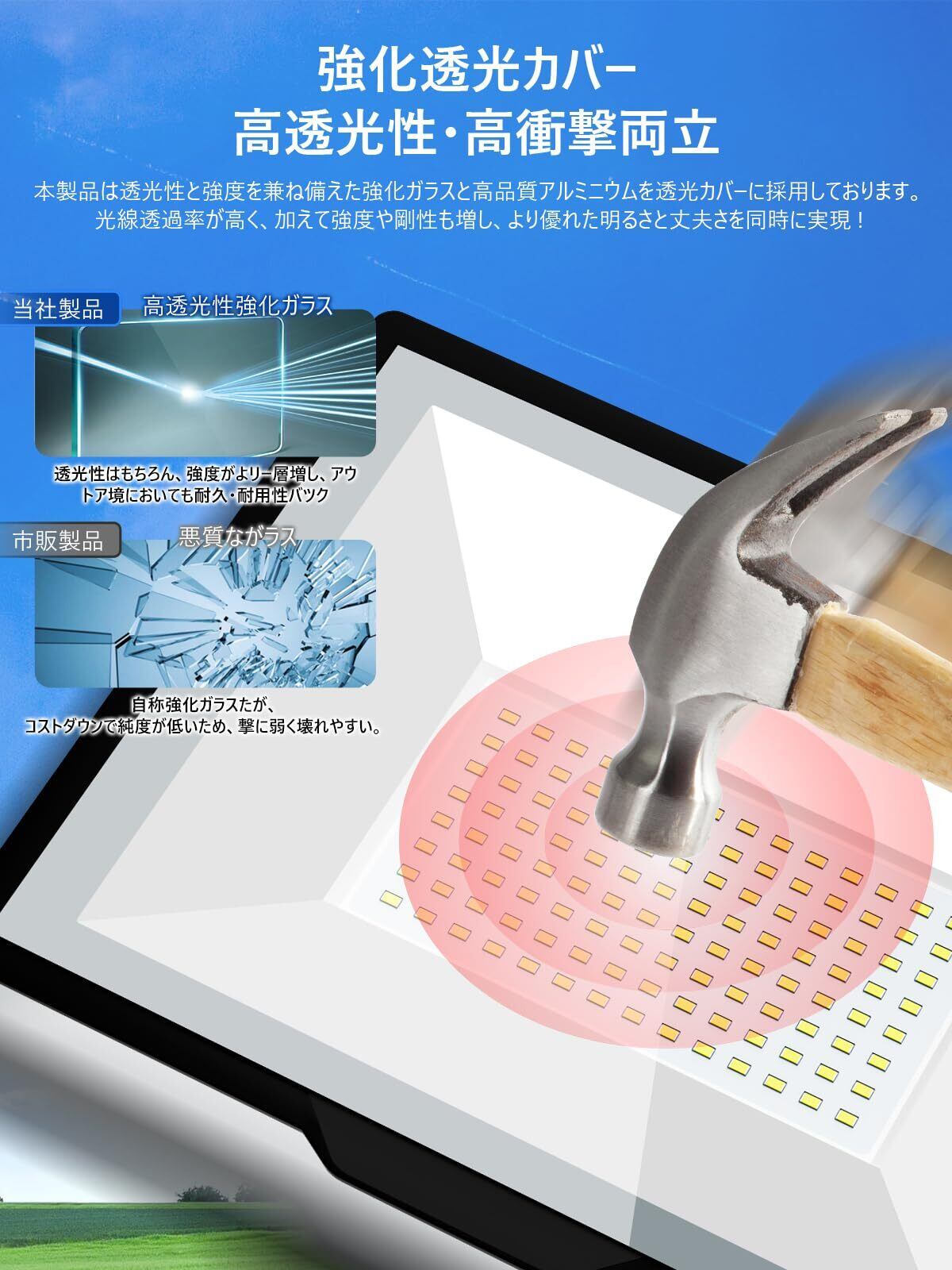 【強化材質・高放熱構造・長寿命】従来品と比べて照射面に高温耐性を持つ防爆強化ガラスを使用し、どんなに極端な使用条件でも長期間で使用でもクリアな光を照射し、寿命は水銀灯の四倍以上で遥かに長寿命です。本体は強固で高品質アルミニウム合金と6mmヒートシンクを採用して、更に大量の櫛型ヒートシンクは空気対流の原理に基づいて設計されることで、熱ダレによる故障を防ぎ、迅速に投光器ライトの放熱問題を解決し、更に長寿命を実現しました。led投光器の放熱表面積を増加させることで、放熱性、安定性、信頼性、寿命がさらに向上します。