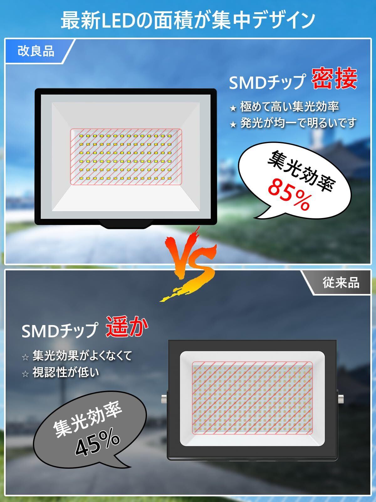 【安定光効・反射効率UP・省エネ】この投光器の基板に、高密度、発光効率の高いled素子、SMDチップを内蔵し、白熱電球2000w相当の明るさに匹敵します。僅か150Wで全光束20000LMまでできます。従来品に比べて発光板の幅を拡大することで、より強力でビーム集中を実現しました。更に、当社の投光器はAC100V~110Vまで対応可能です。消費電力は蛍光灯の約半分!76%以上の電気代を節約出来ます。安定した明るさを提供し、省エネで長寿命を実現!
