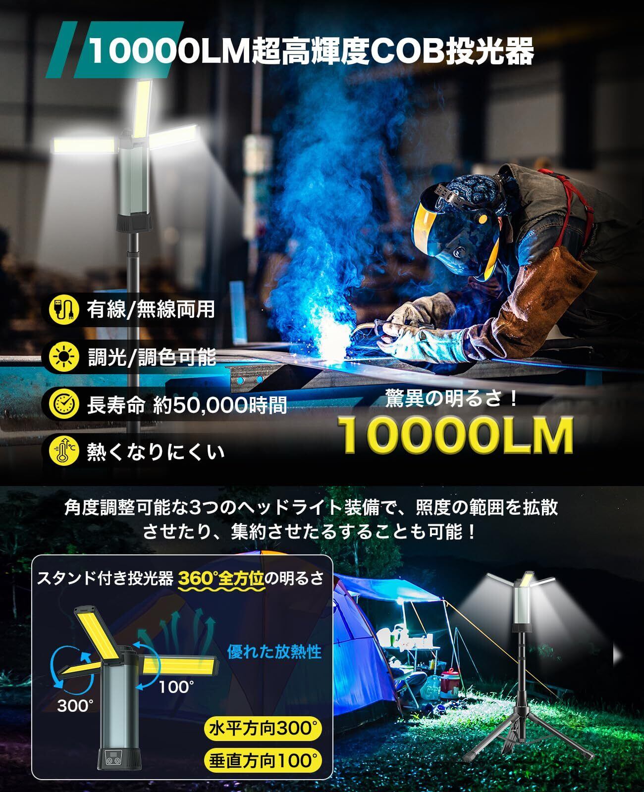 【3ヘッドライト・高さ調節50-120cm・三脚スタンド付き】投光器は角度調整可能な3つのヘッドライトを装備しており、垂直100度・水平300度の回転調整が可能で、全体で360度の全方位照明が実現できます!また、50-120cmの高さ調節が可能で、照射範囲を最大限に広げます。持ち運びに便利な作業用ライトであり、屋外用ライトでもある。すべての家庭にふさわしいフラッドライトです。さらに、折りたたみ式な三脚スタンドが付いており、持ち運びや収納がラクラク!