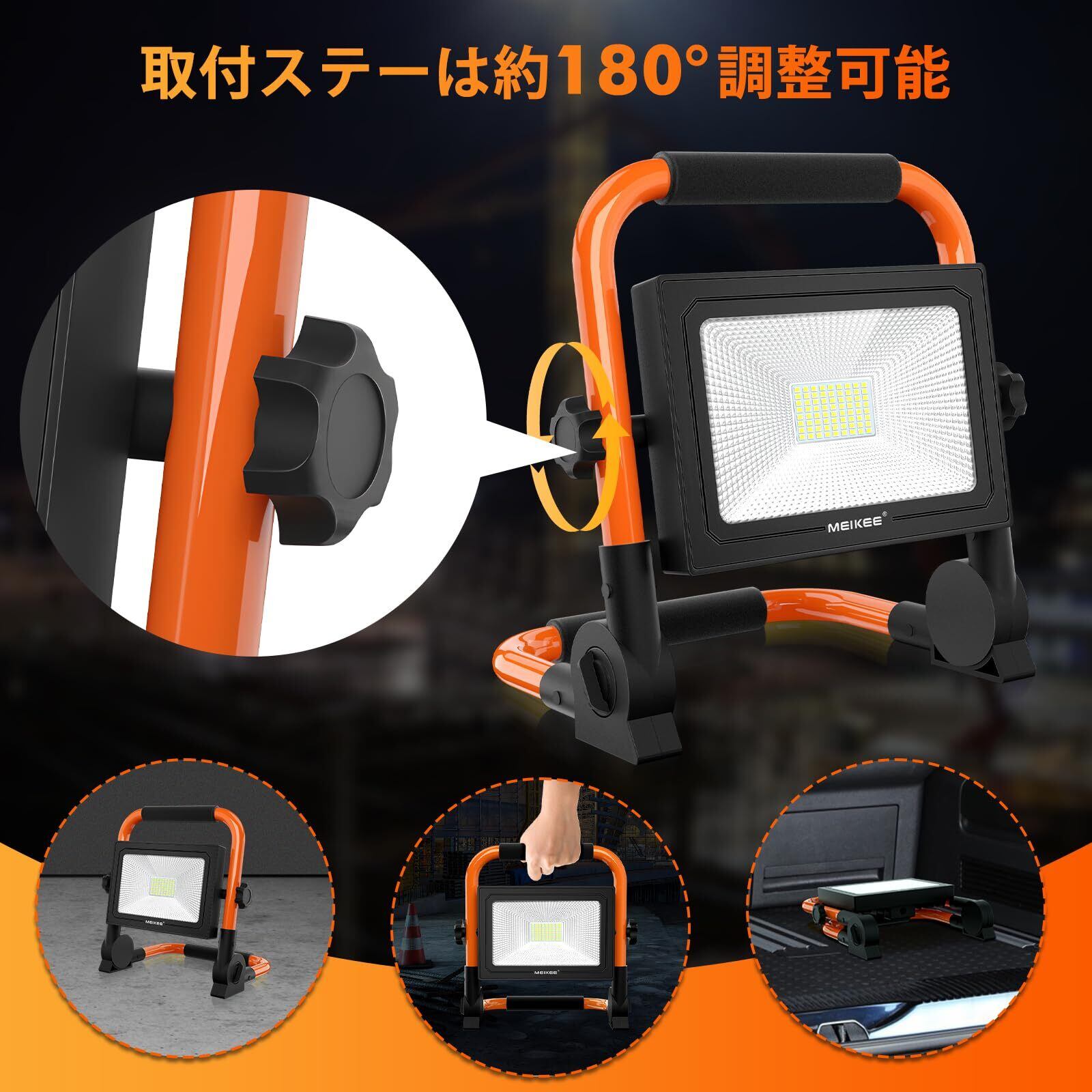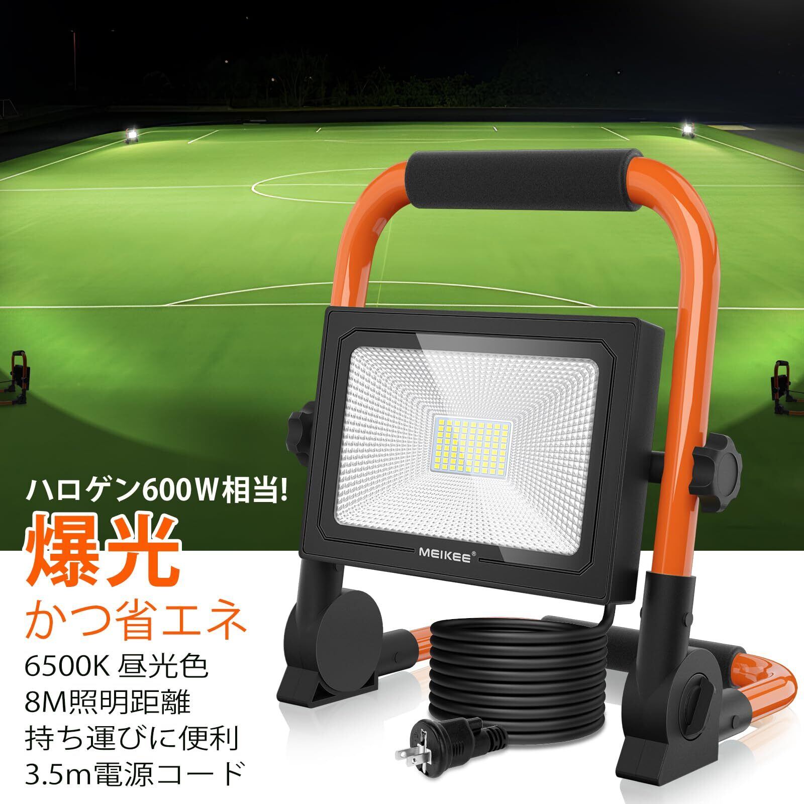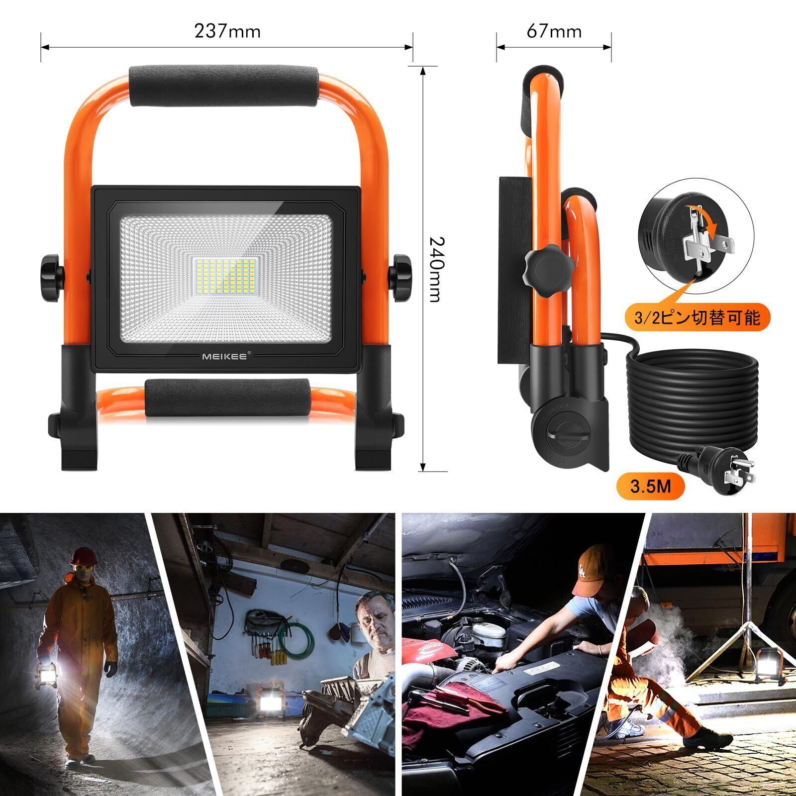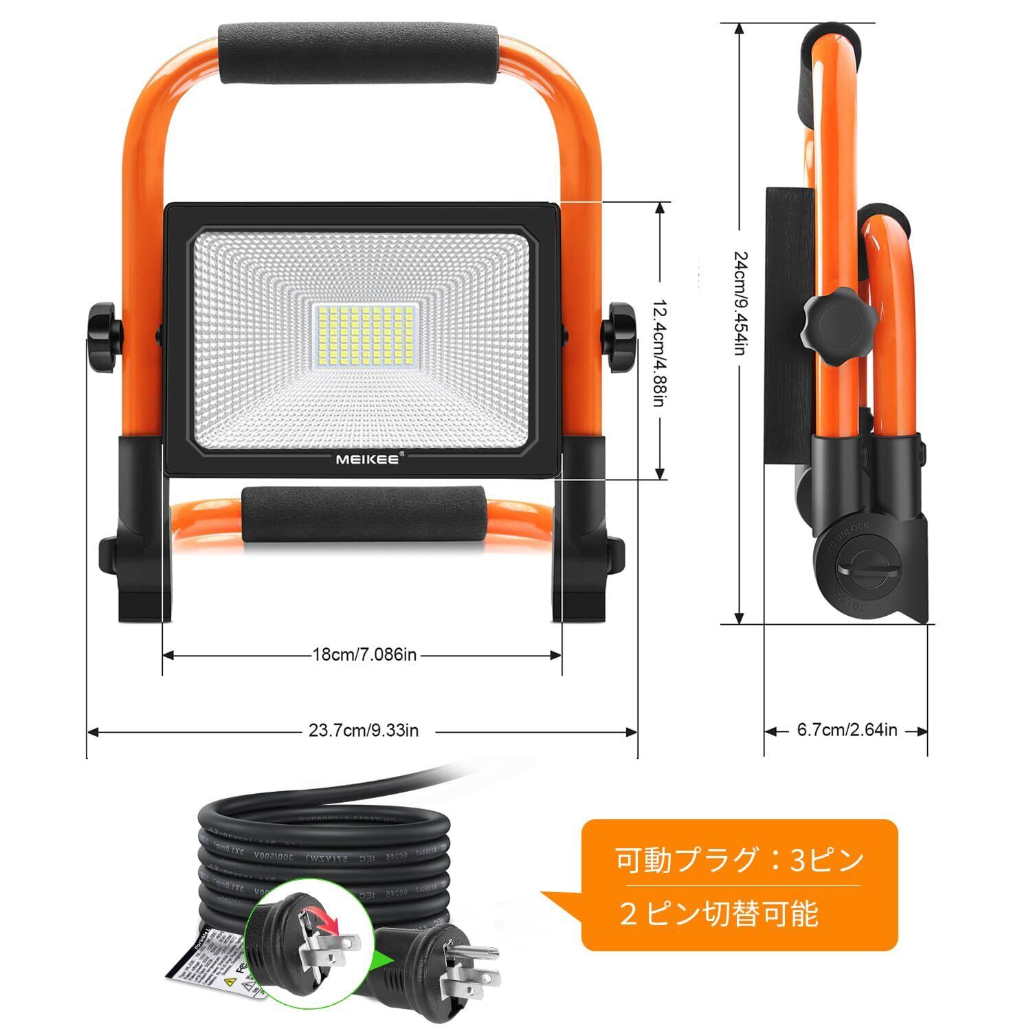 MEIKEE 爆光LED投光器 作業灯 ポータブル投光器 フラッドライト 3P/2Pプラグ変換でき 置き型 60W 5200LM 600W相当 省エネ 6500K白色 50000時間使用寿命 SMDチップ*72 IP66防水 3.5Mコード 90-110V対応 PSE認証済み 工事現場 車修理 庭BBQ 倉庫照明 屋外作業 日本語説明書(オレンジ)インボイス番号記載の適格請求書提供可能 | KSショップ