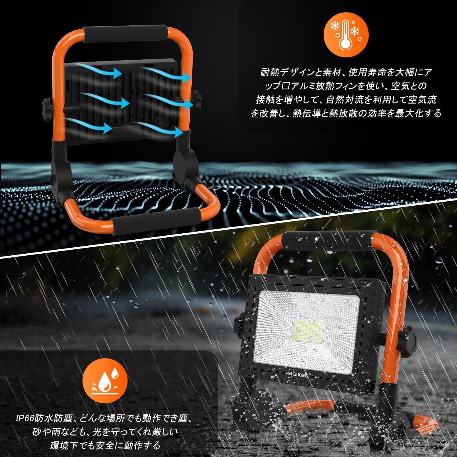 【IP66防水防塵仕様】本体がアルミニウム合金と高品質pcからきっちり組み立て、高品質なゴム製のコード、防水防塵仕様はIP66となります。悪質環境にも関わらず、(例え:粉塵だらけの工事現場、雨天の緊急工事)、MEIKEEポータブル投光器は大した照明器具になれますようにしっかり動作し続けます。