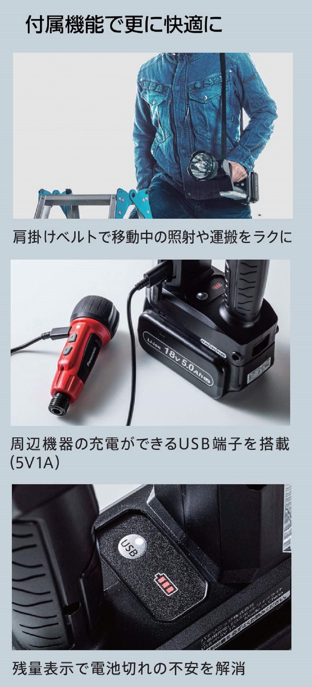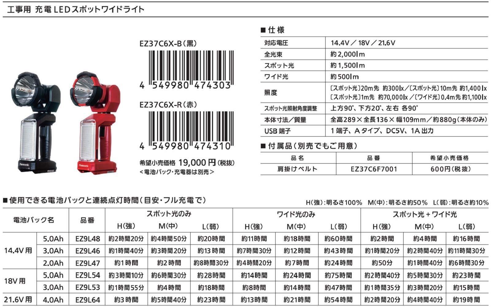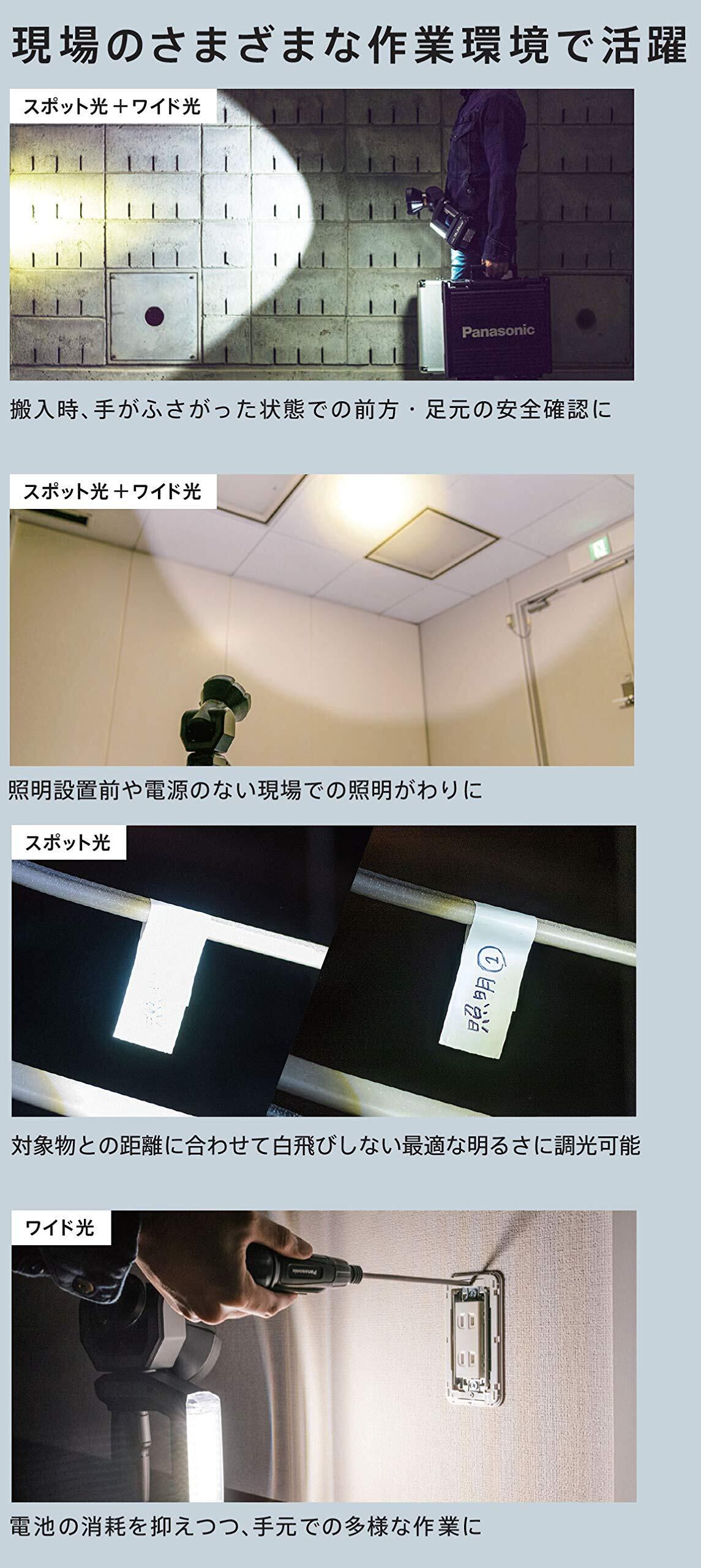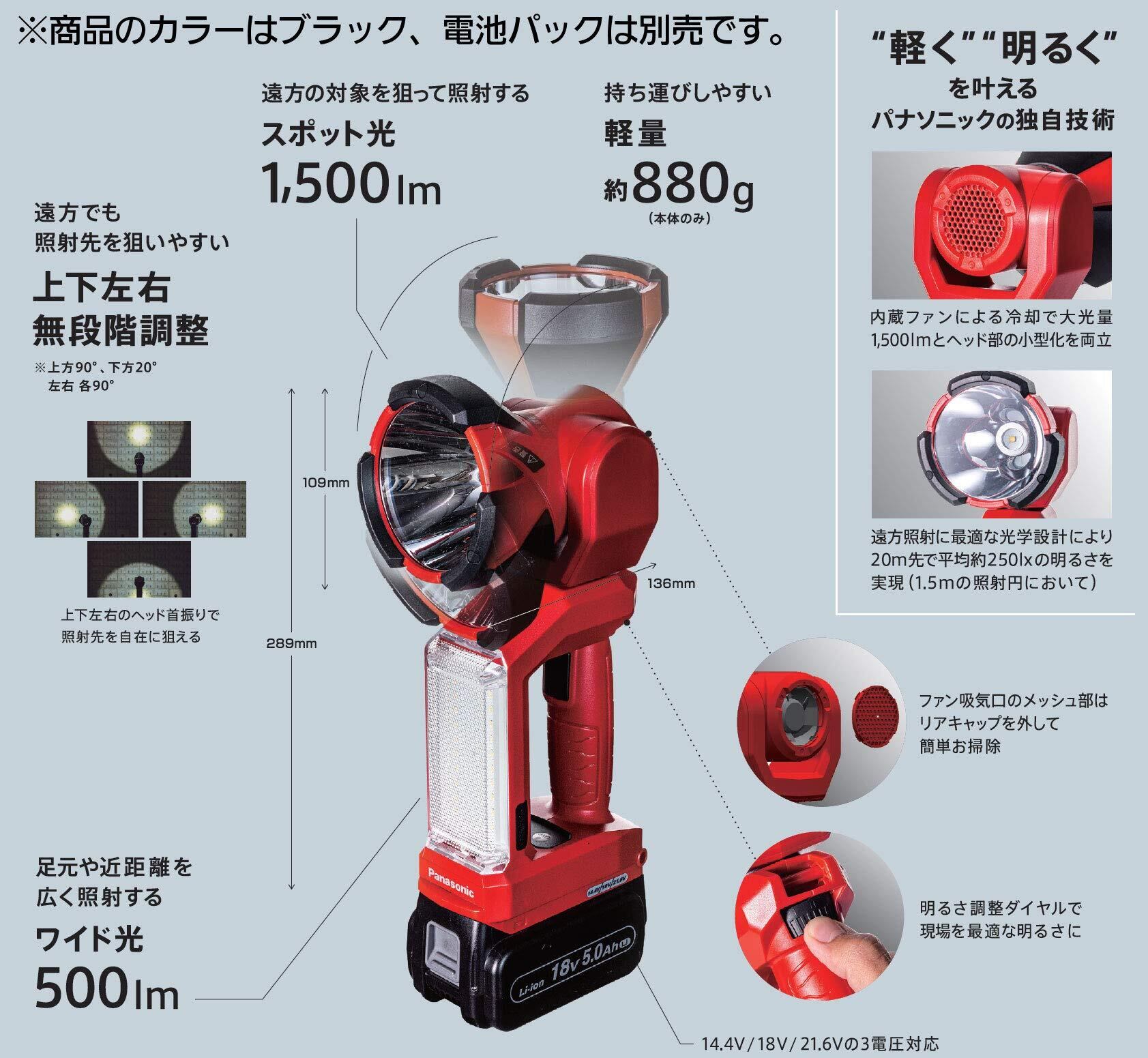 パナソニック(Panasonic) 充電LEDスポットワイドライト 本体のみ(電池パック・充電器別売) デュアル (14.4V/18V/21.6V対応) スポット光1500lm ワイド光500lm 作業灯 電気工事 ワークライト 投光器 EZ37C6X-B ブラック | KSショップ