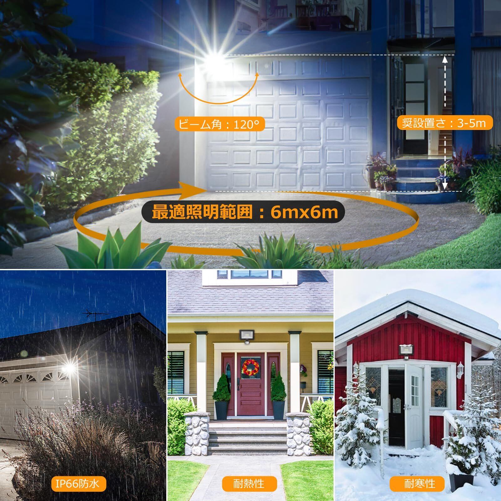 【IP66防水&耐久性抜群】:LEDセンサーライト本体はIP66防水等級に適合しています。センサーはIP65です。雨・雪・霧などの悪天候でも耐えるように設計されております。屋根のない場所、外からの雨にさらされるような場所に設置しても安心です。庭、ガーデン、玄関、廊下、家庭菜園、通路など様々なシーンで大活躍。大雨の日でも使用可能ですが、水に浸すことは禁止されています。