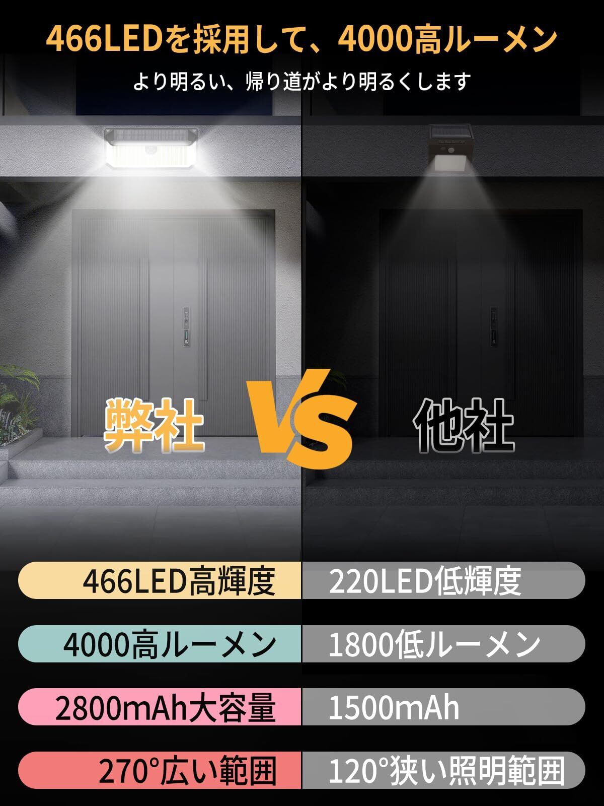 ソーラーライト 屋外 4000LM高輝度 防犯/防災ライト 防水 人感センサーライト 極高輝度業界【466LED・3面発光】3つ知能モード 2800mAh大容量バッテリー 防犯 太陽光発電 電気代ゼロ 自動点灯/消灯 ガーデン/壁掛け/庭先/表玄関/駐車場/停電時適用 地震/津波/台風/防災に対応 (1セット)