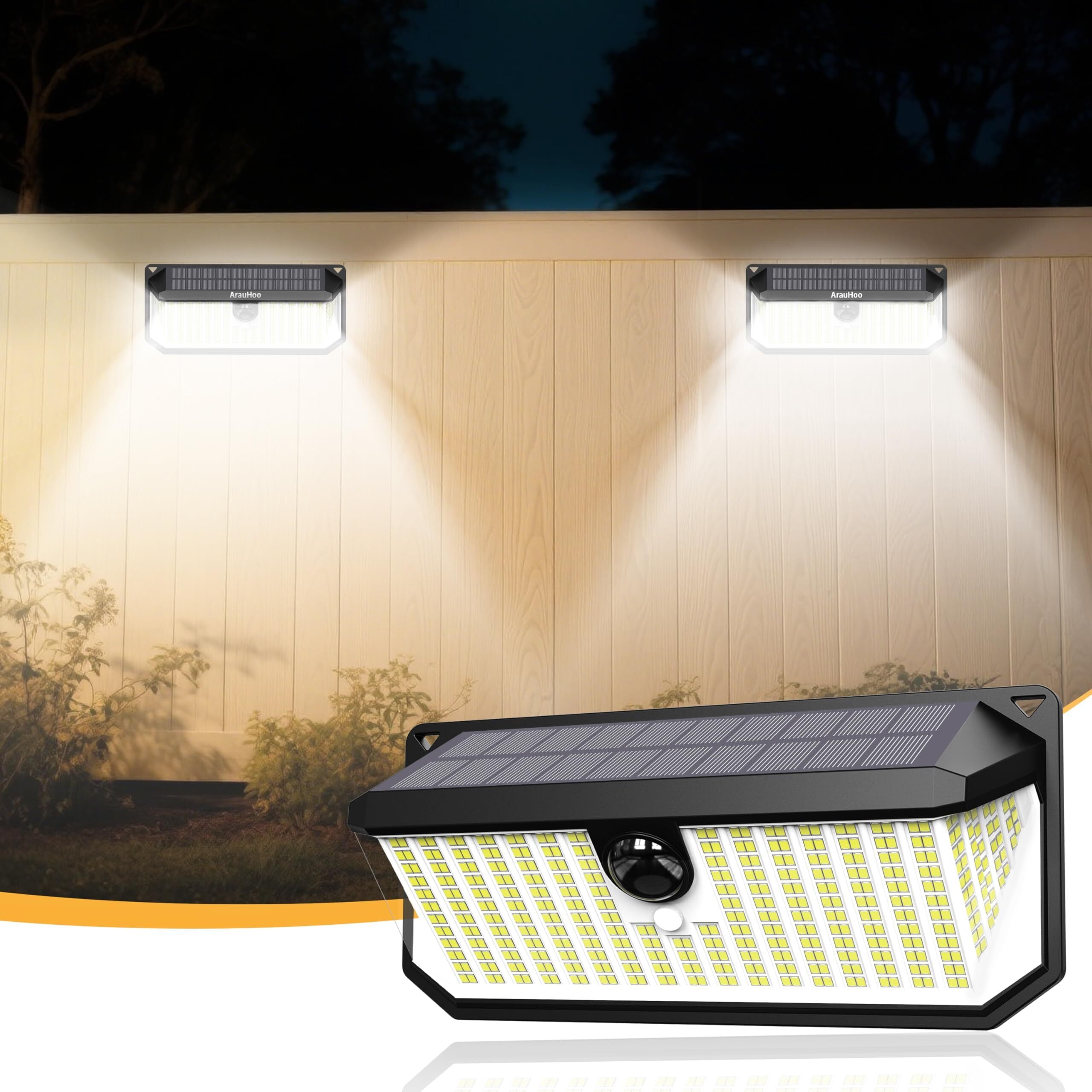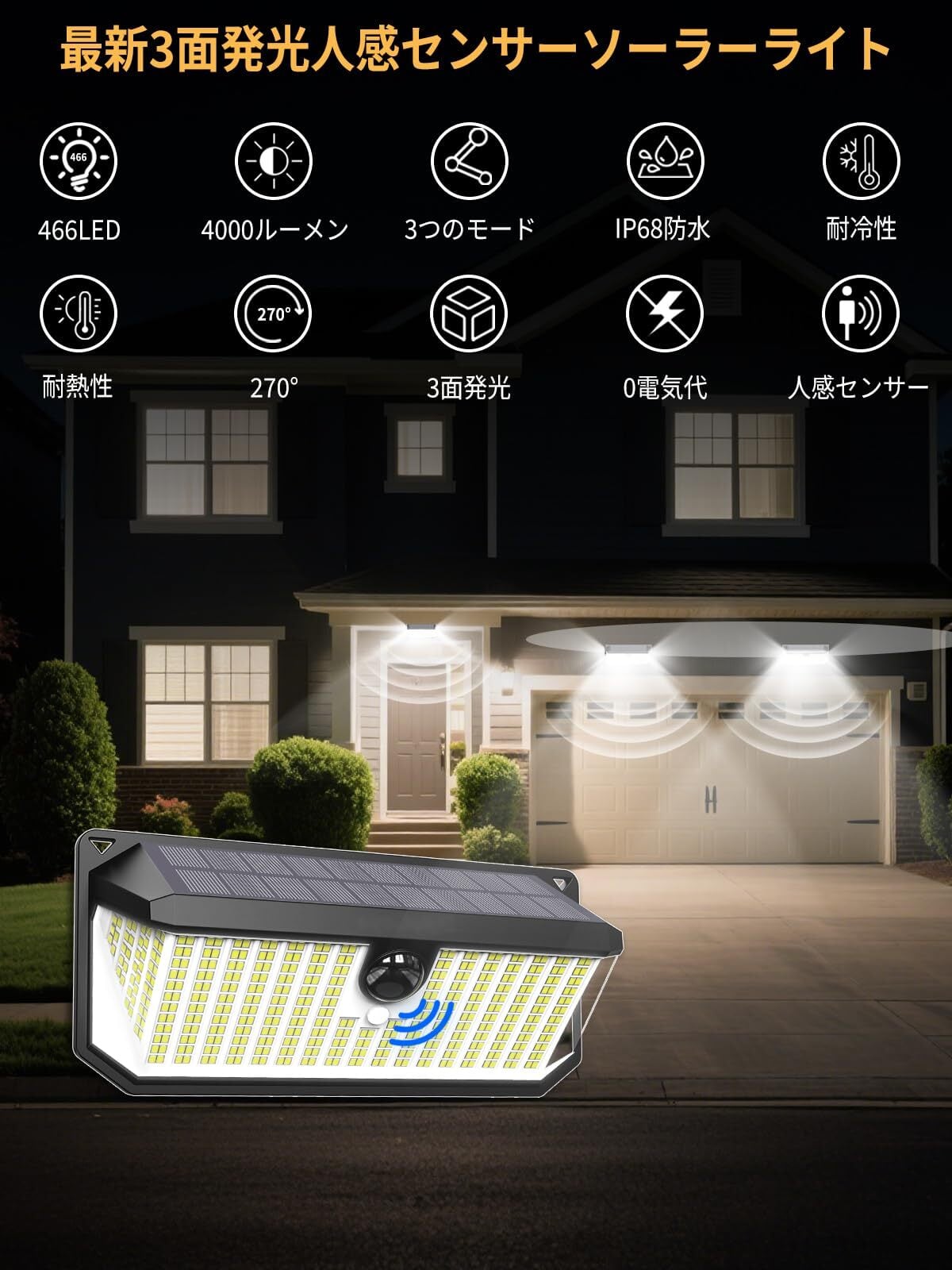 【新世代466個4000LM高輝度LED・3面発光・270°照明】このソーラー ライトは日中は真夜中でも明るい!センサーライトは 自動充電・夜暗くなると自動点灯。466個の高輝度LEDが放つ昼光色4000lmは、従来品の約2倍の明るさで庭全体をくまなく照らします。3方向発光デザインが生む広角270°照明で、死角を徹底排除。防犯性が飛躍的に向上!